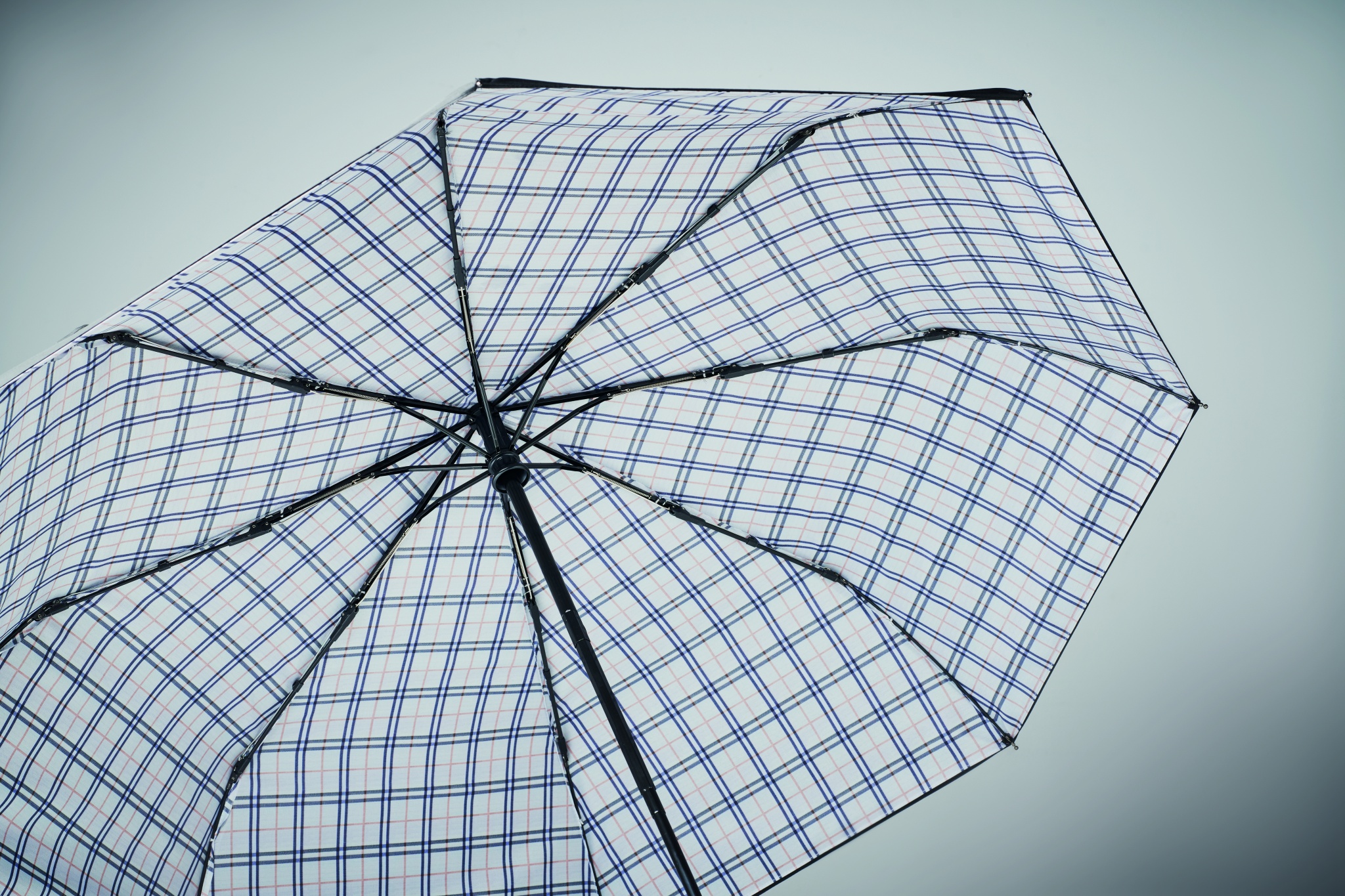 23'''' Regenschirm aus doppellagigem 190T Pongee, 3fach gefaltet. Windbeständig. Karierte Innenseite. Schwarz beschichteter Stock und Stangen. Mittelteil aus schwarzem, vernickeltem Fiberglas. Gebogener, gummierter ABS-Griff. Automatische Öffnung und Schließung.
