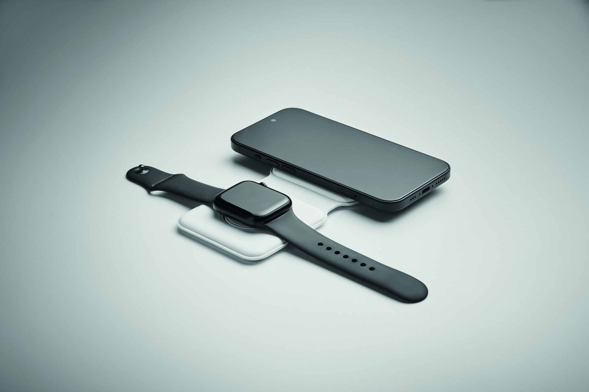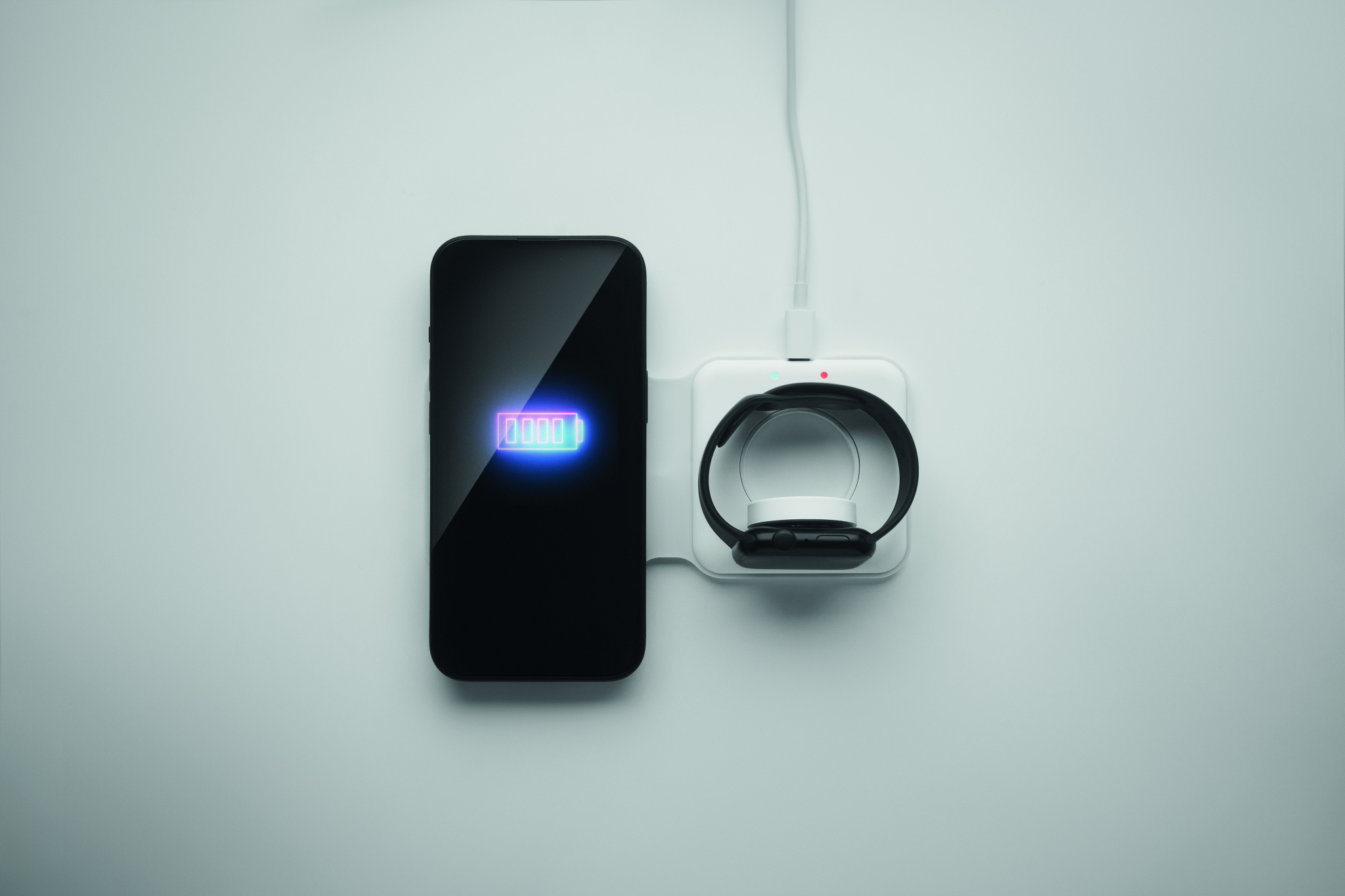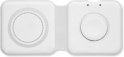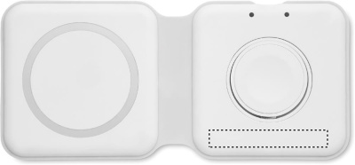 Faltbare Ladestation 2in1. ABS. Sie verfügt über ein kabelloses Ladegerät 15W und ein Smartwatch-Ladegerät (nur Apple®).
