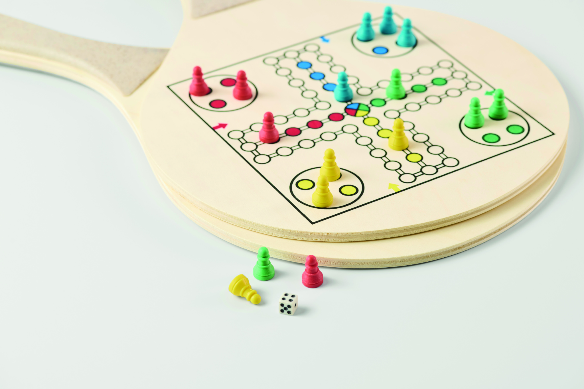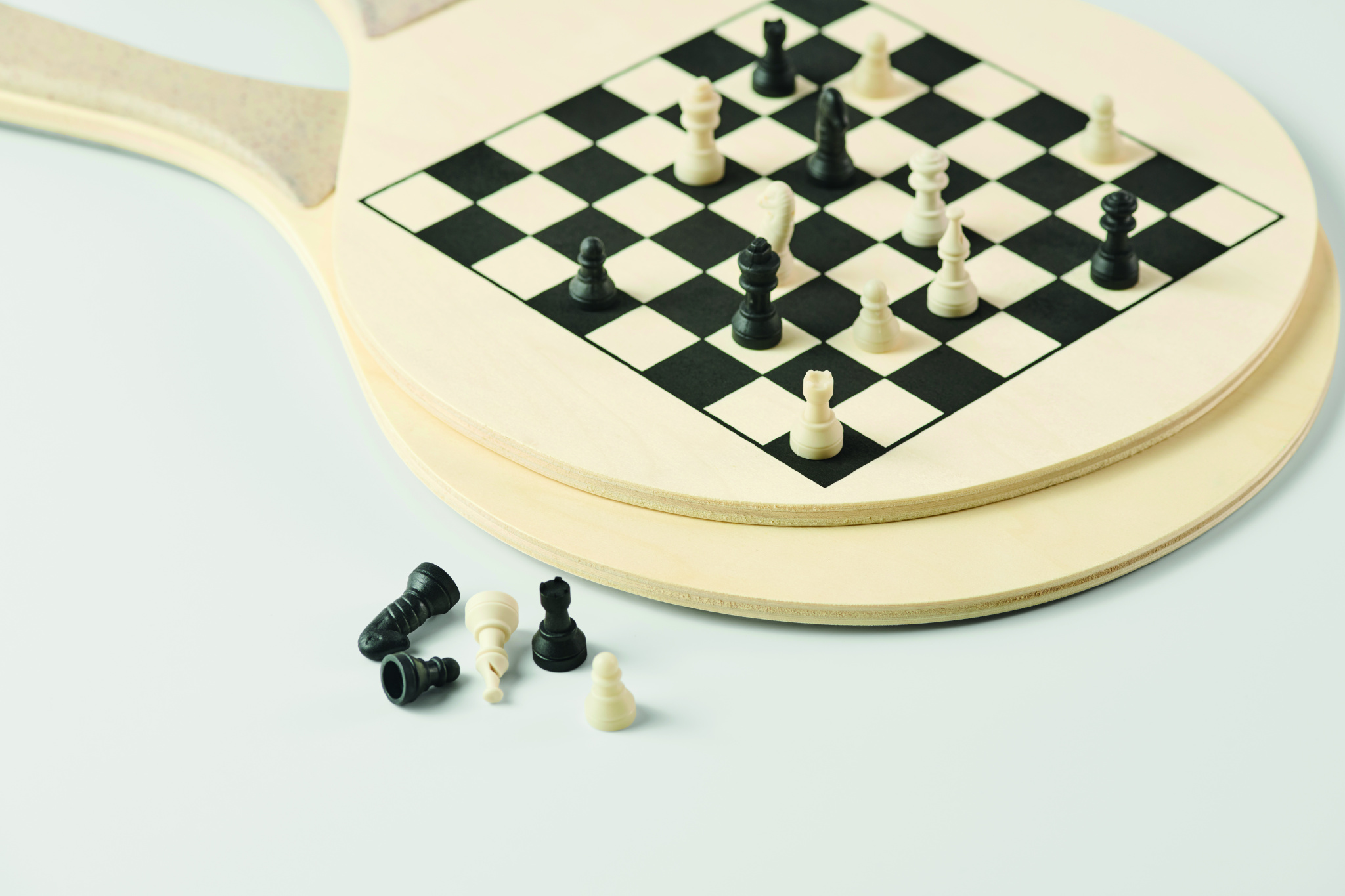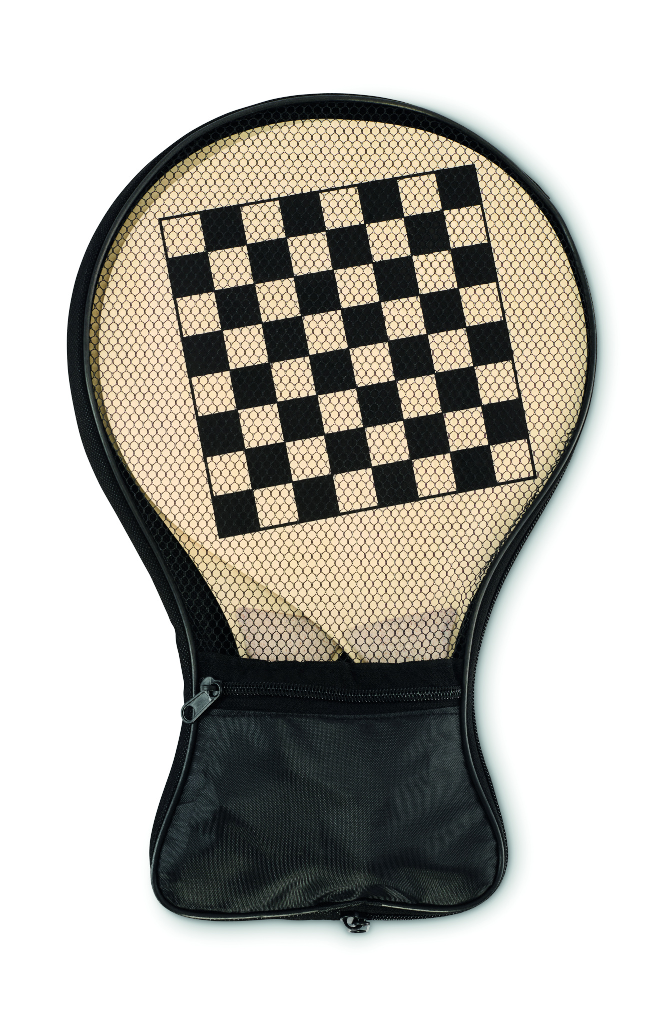 Beachball mit 2 Schlägern aus Sperrholz mit Schach- und Ludo-Spielbrett. Inkl. TPR-Spielball, Würfel und Steinen. Lieferung in RPET-Mesh-Tragetasche mit Reißverschluss.