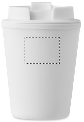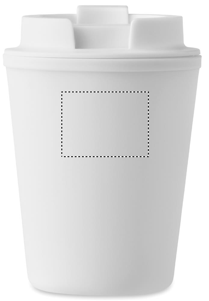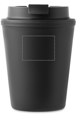 Doppelwandiger Trinkbecher mit Trinkdeckel aus recyceltem PP. Füllmenge: 300 ml.