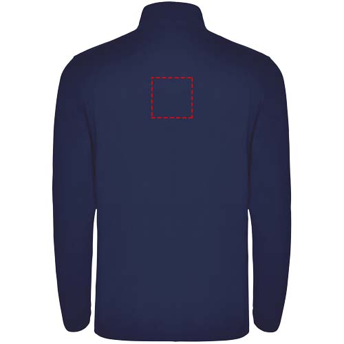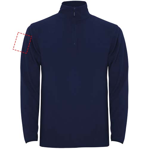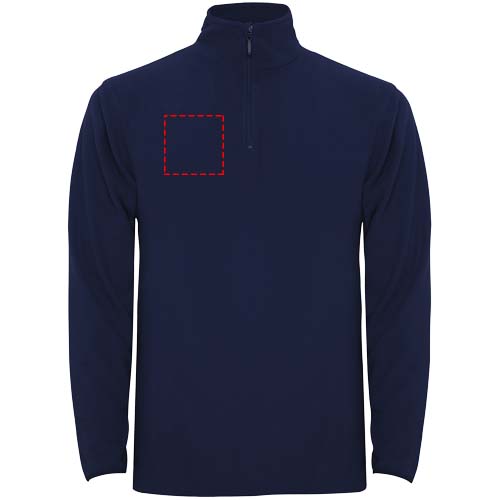 Mikrofleece mit halbem Reißverschluss im Nacken und Kinnschutz. Ärmelbündchen mit passendem Gummizug. Herausnehmbares Etikett. Das Modell ist 190 cm groß und trägt Größe L.