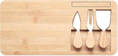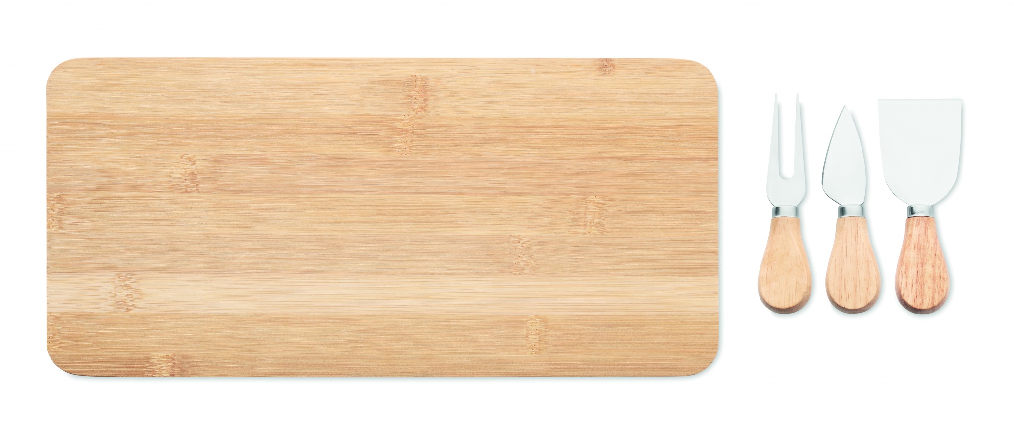 Käse-Set aus Bambus mit Servierbrett, 2 Käsemessern und Käsegabel. Bambus ist ein natürliches Produkt, es kann daher zu leichten Abweichungen in Farbe, Dekor und Maßen kommen.