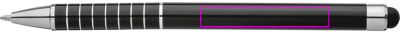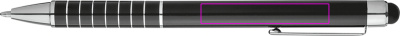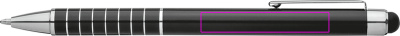 Metall-Drehkugelschreiber mit Touch-Funktion und blauschreibender Mine. 8 gravierte Ringe erleichtern das Schreiben. Ihre Werbung wird unterhalb des Clips per Laser eingraviert.