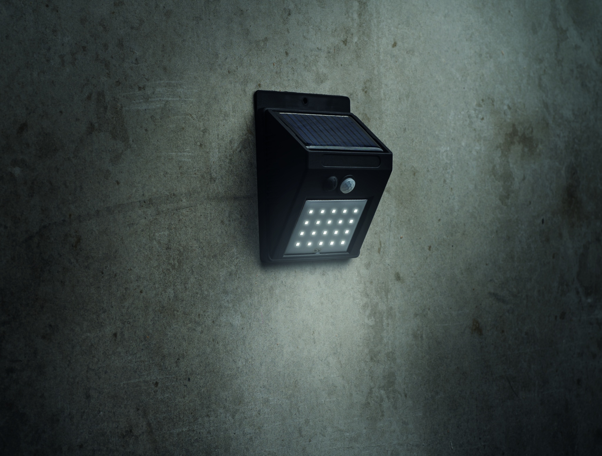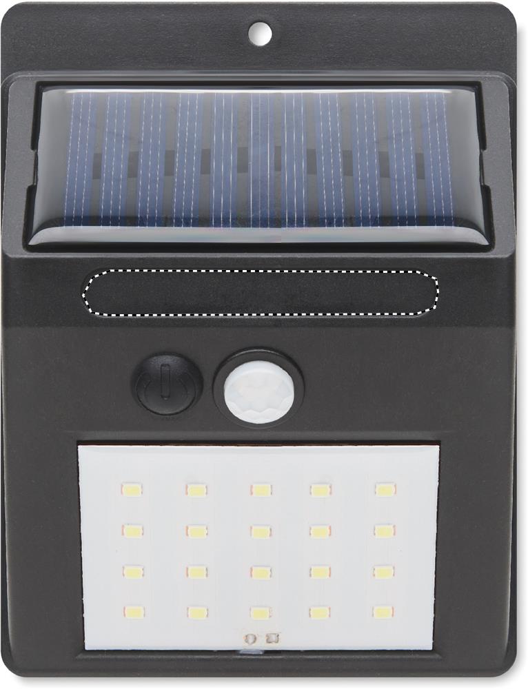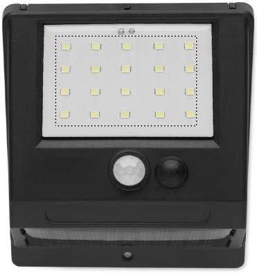 Solarbetriebene LED-Leuchte mit 20 LEDs. Bewegungs- und Nachtsensor. PIR (Passiv-Infrarot-Sensor) Bewegungssensor. CDS-Nachtsensor. Schutzart: IP 44. Akkukapazität: 800 mAh.