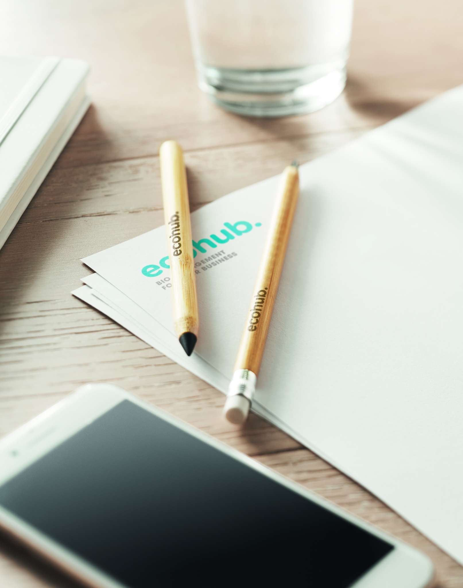 Langlebiger Stift aus Bambus mit Papierkappe. Der Stift schreibt mittels Grafitspitze. Dies macht diesen Stift zu einer großartigen nachhaltigen Alternative zum herkömmlichen Stift. Da Bambus ein natürliches Material ist, können Farbton und Maße pro Artikel variieren. Dies kann Abweichungen im Ergebnis der Veredlung führen.