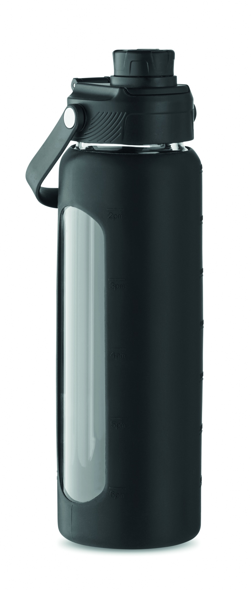 Trinkflasche aus hochwertigem Borosilikatglas mit durchbrochener Silikon-Schutzhülle. Deckel aus PP mit Tragegriff. Auslaufsicher. Füllmenge: 750 ml.