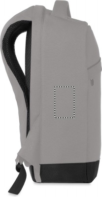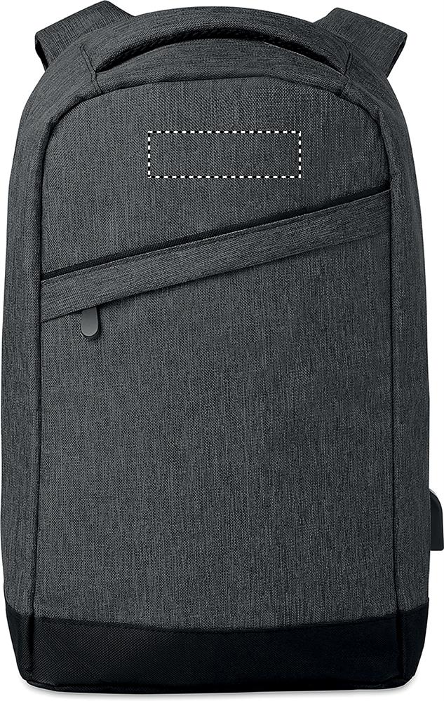 600D 2 tone Polyester backpack with padded shoulder strap with main internal compartment. Includes one internal 13'' laptop compartment and an USB charging cable. Zipper main compartment on backside for better protection.