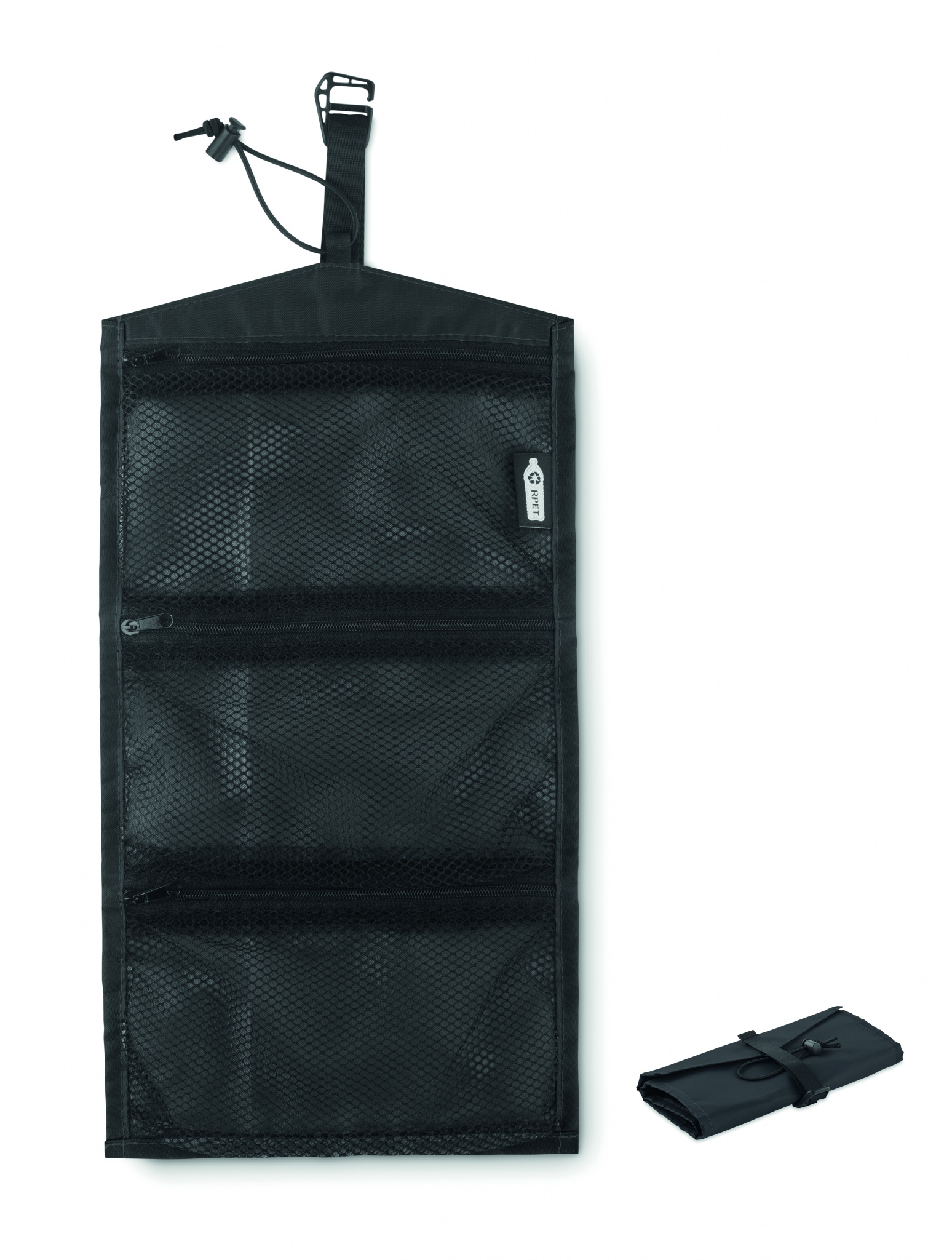 210D RPET cable roll bag organizer. It has a RPET mesh with 3 zippered compartments. This bag can also be used as a cosmetic bag.
