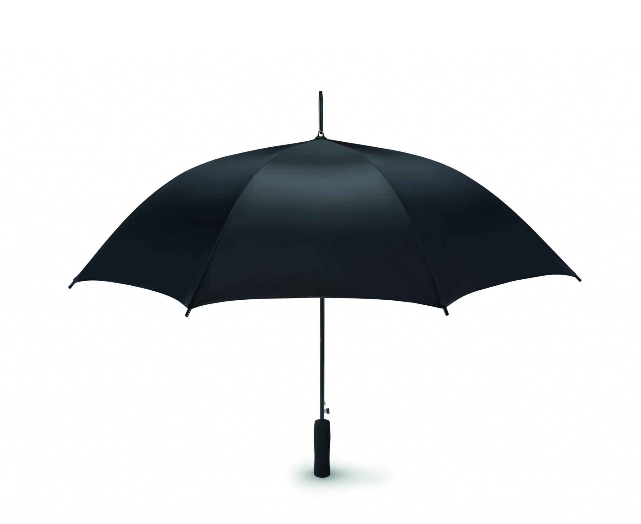 23 Inch auto open umbrella in 190T pongee with black plated metal shaft and ribs. Black plastic tips. Straight black EVA handle. Manual closure.