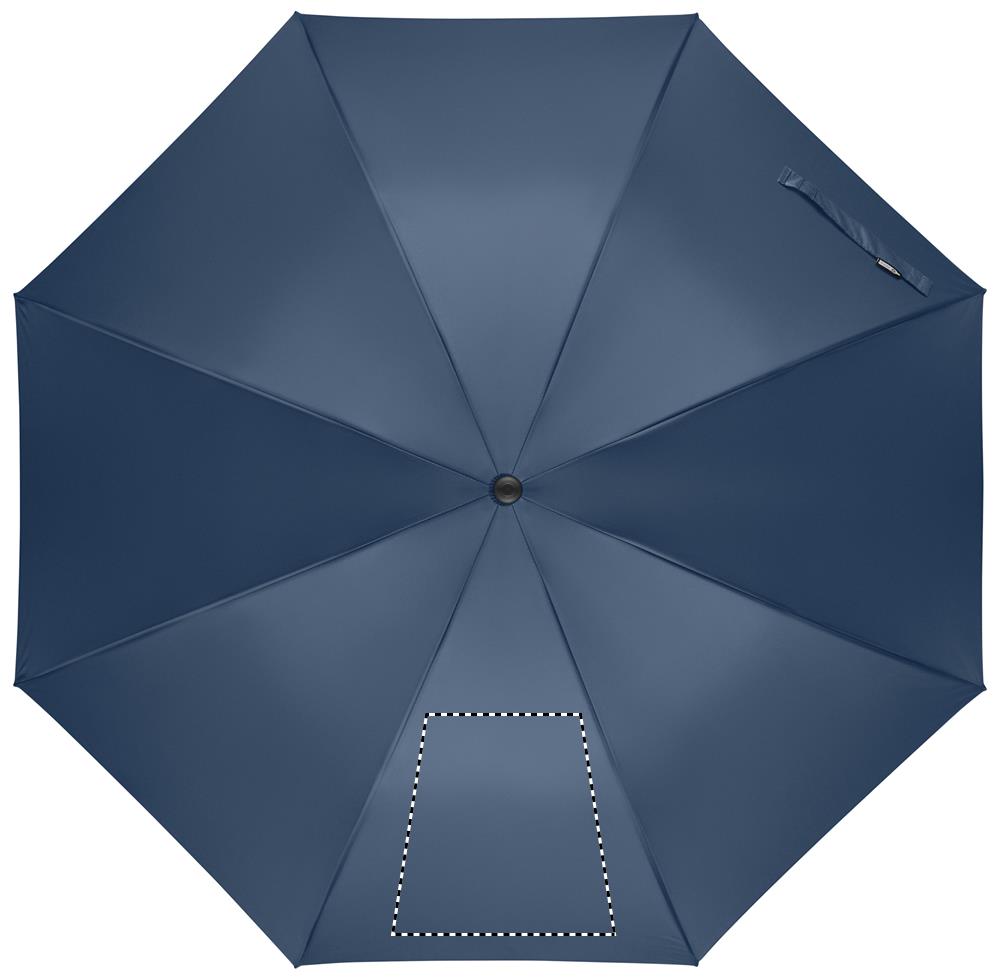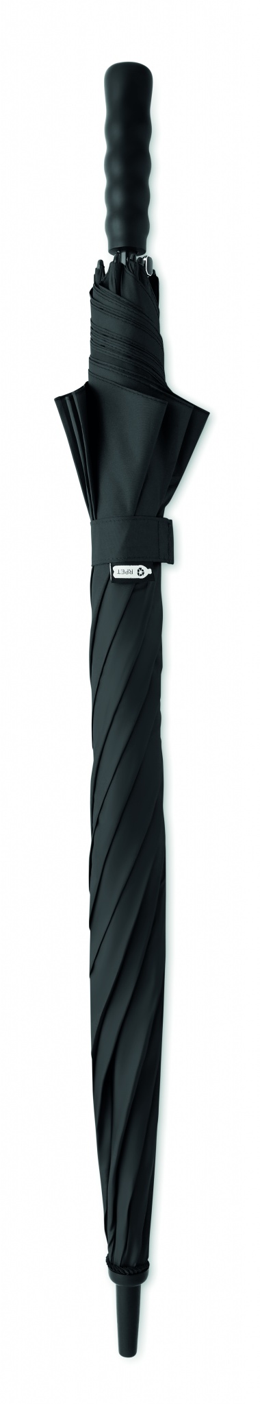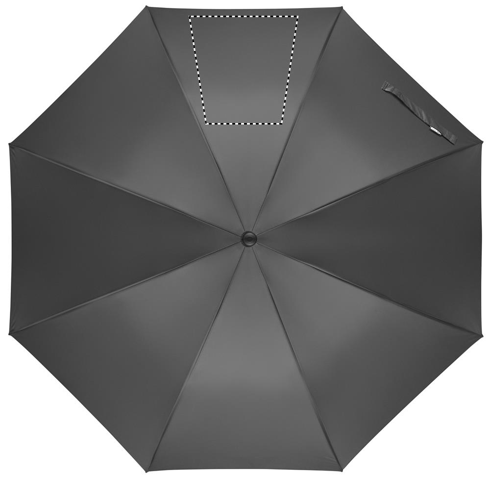 27 inch auto open wind-proof umbrella in 190T RPET pongee. Fibreglass shaft and ribs. Wheatstraw and recycled ABS handle. Plastic tips and top.