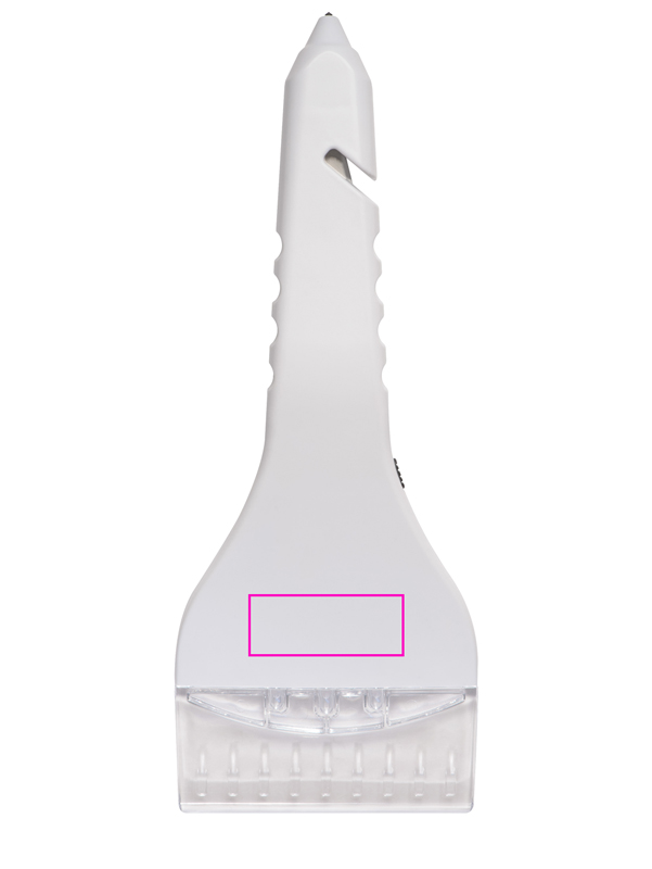 4in1 ice scraper made of ABS. The ice scraper works also as a belt cutter, glass hammer or, thanks to its 3 LEDs, as a flashlight. We print your logo centered on the scraper.