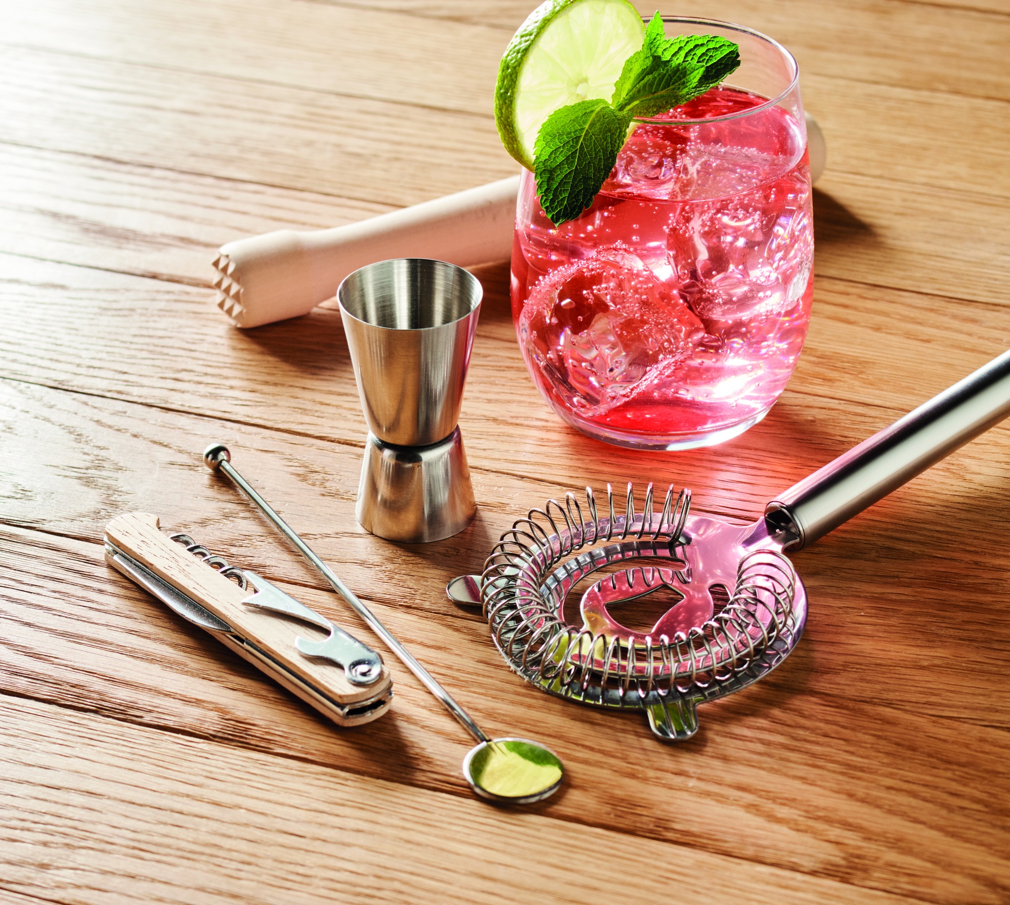 Cocktail kit in cotton pouch with string. Including 5 piece: a double-sided measuring jigger (15 & 30 ml), wooden muddler, cocktail strainer, drink stirrer and waiter's corkscrew knife.
