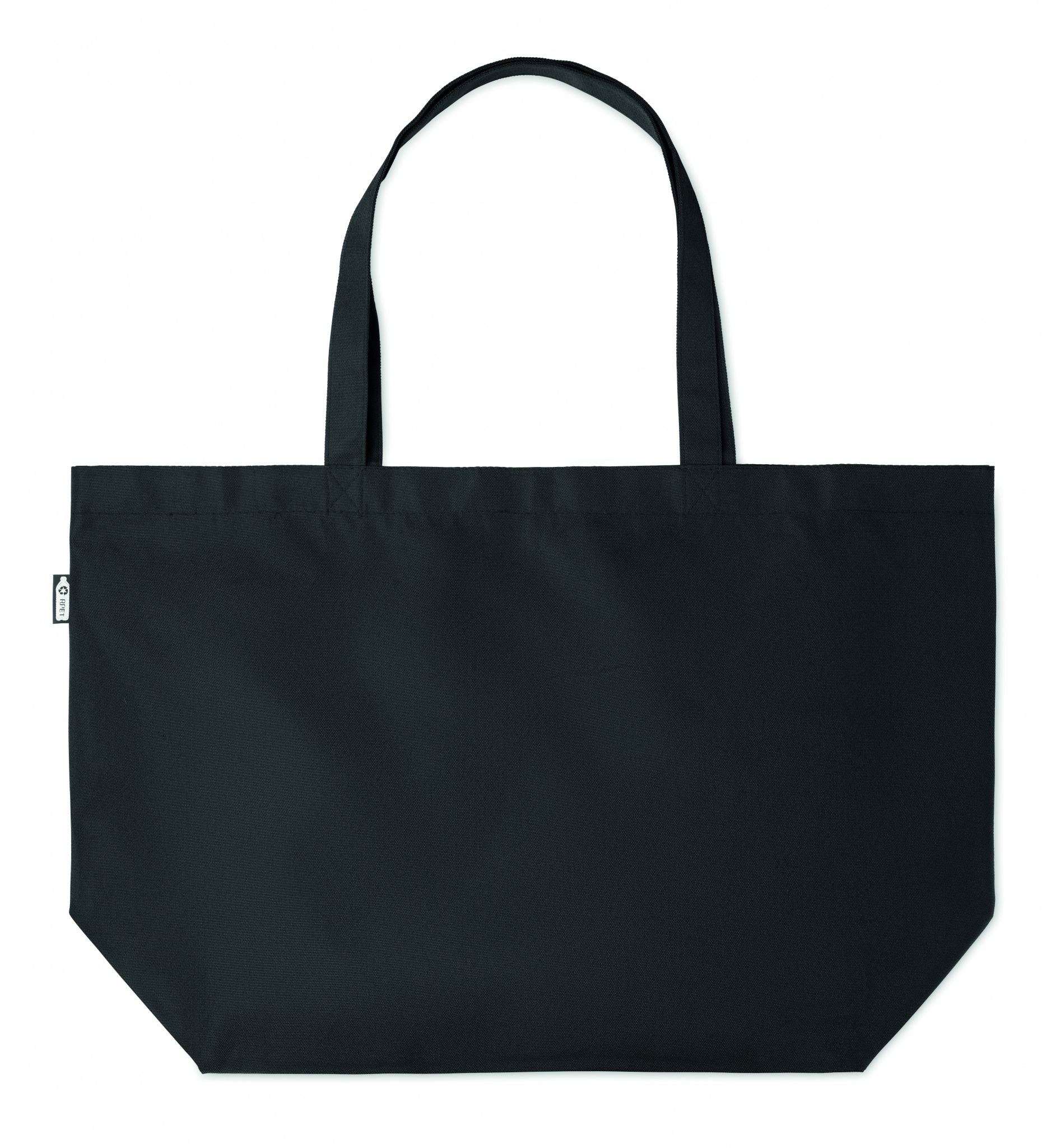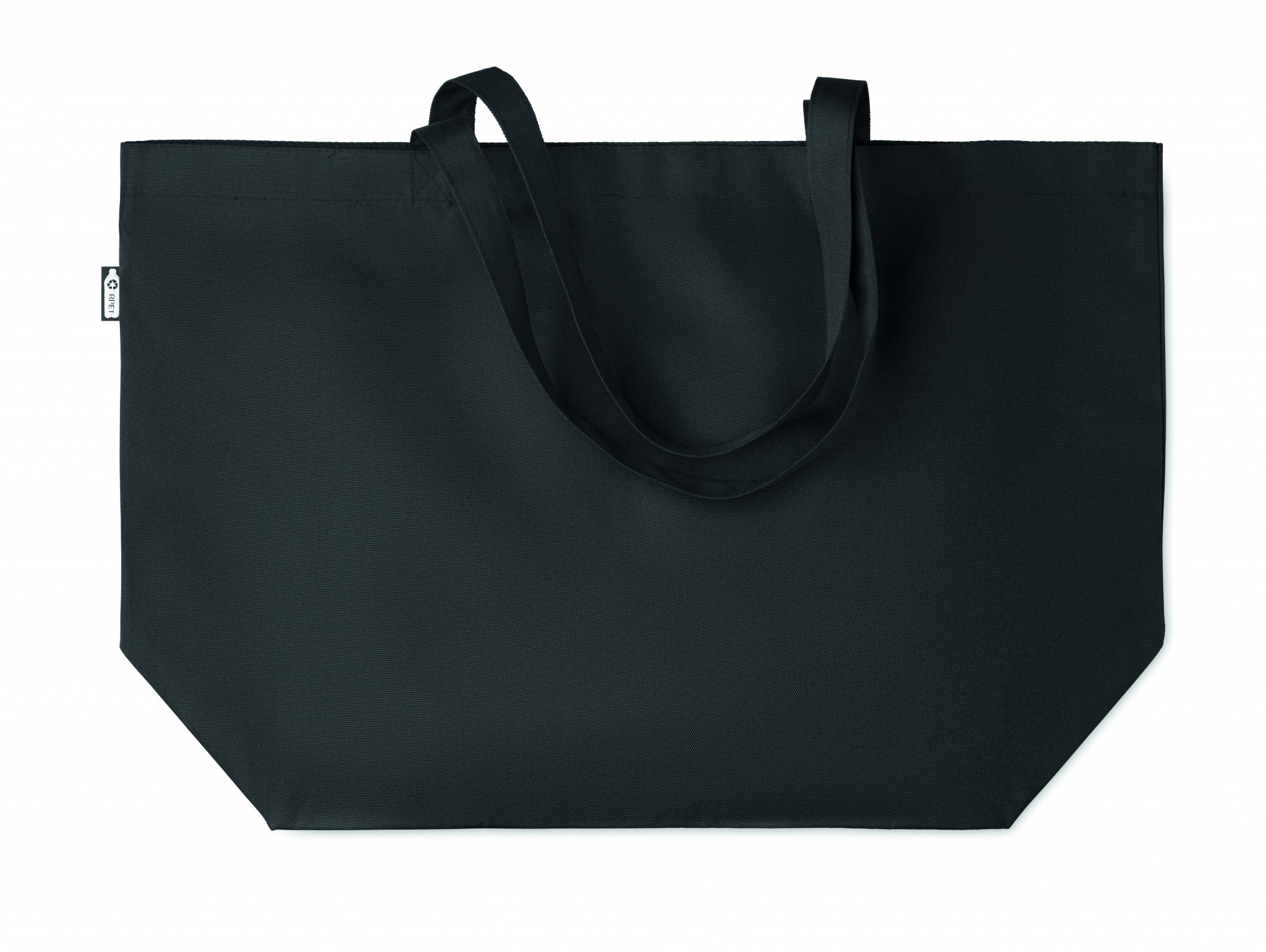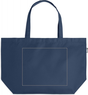 Large shopping bag or beach bag in 600D RPET with long handles and bottom gusset.