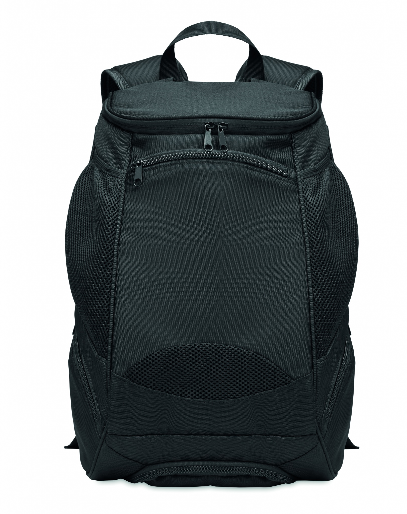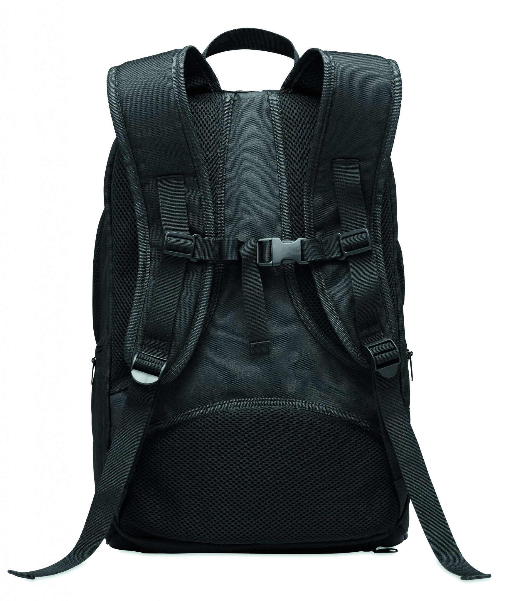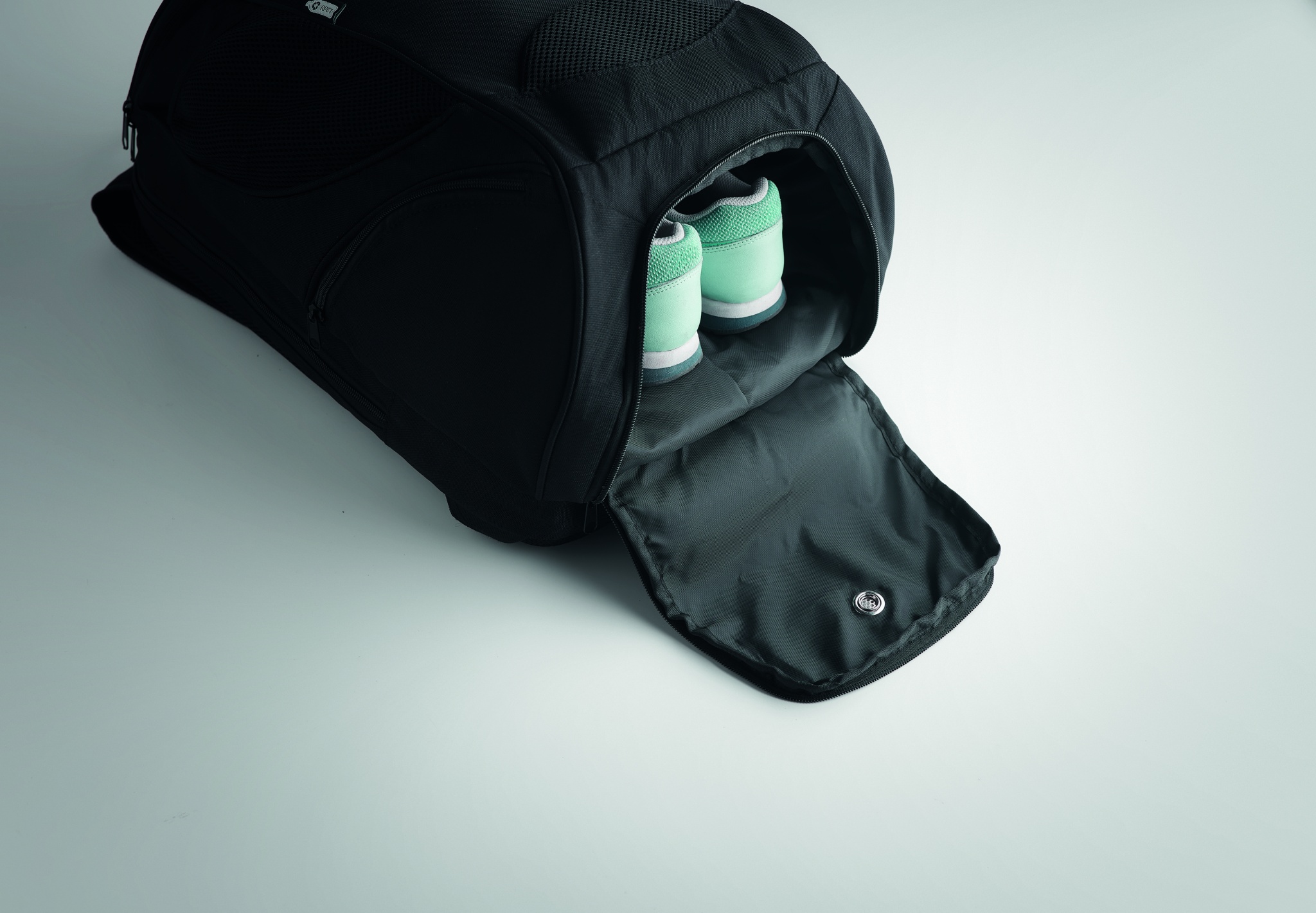 Multifunctional 600D RPET sports rucksack with several compartments (including padded compartment for paddle racket). Includes adjustable shoulder strap.