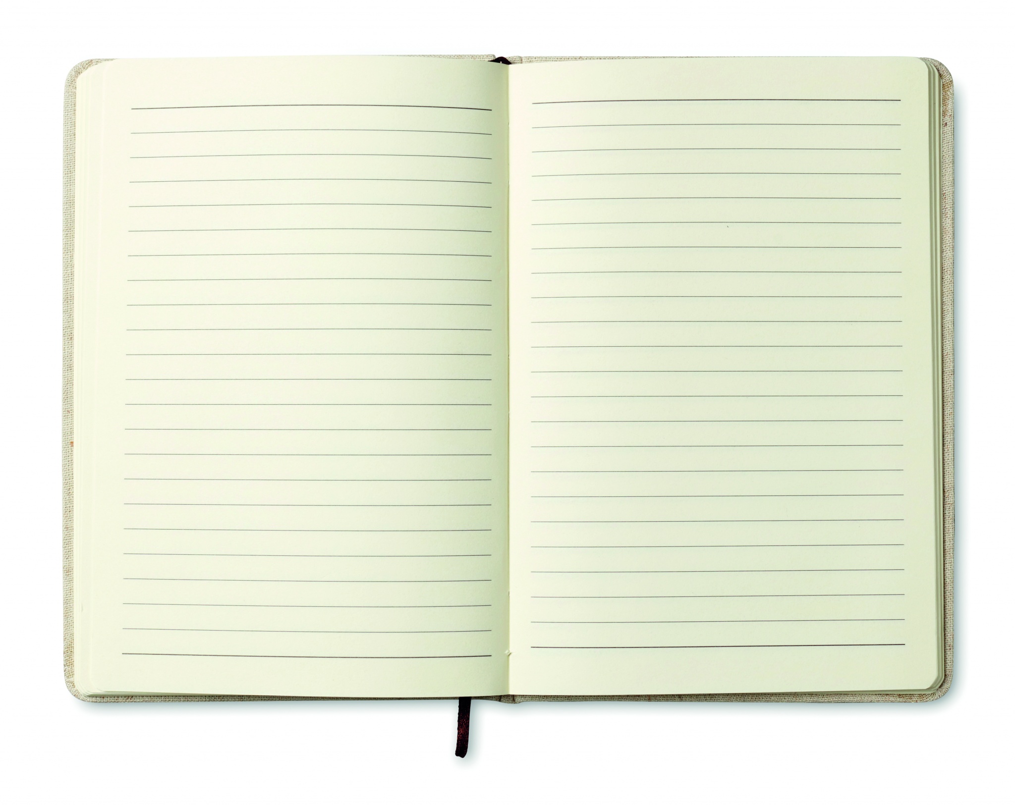 A5 notebook with hard canvas cover. Casebound. 192 lined pages (96 sheets). Contrasting elastic closure strap and ribbon page-marker.