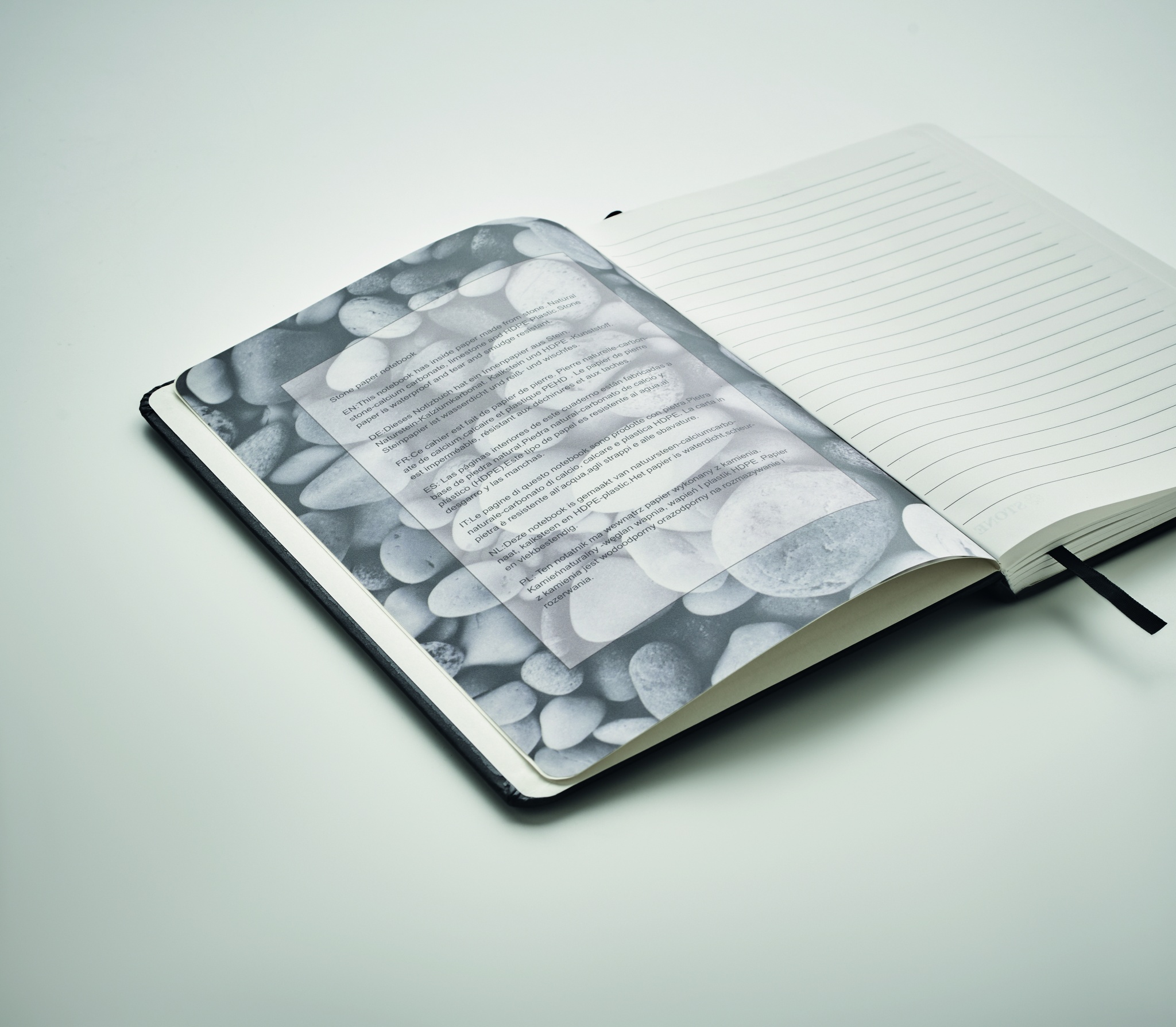 A5 notebook with hard recycled carton cover. Casebound. 160 stone paper lined pages (80 sheets). Elastic closure strap and ribbon page-marker.