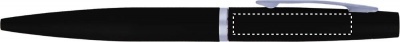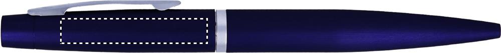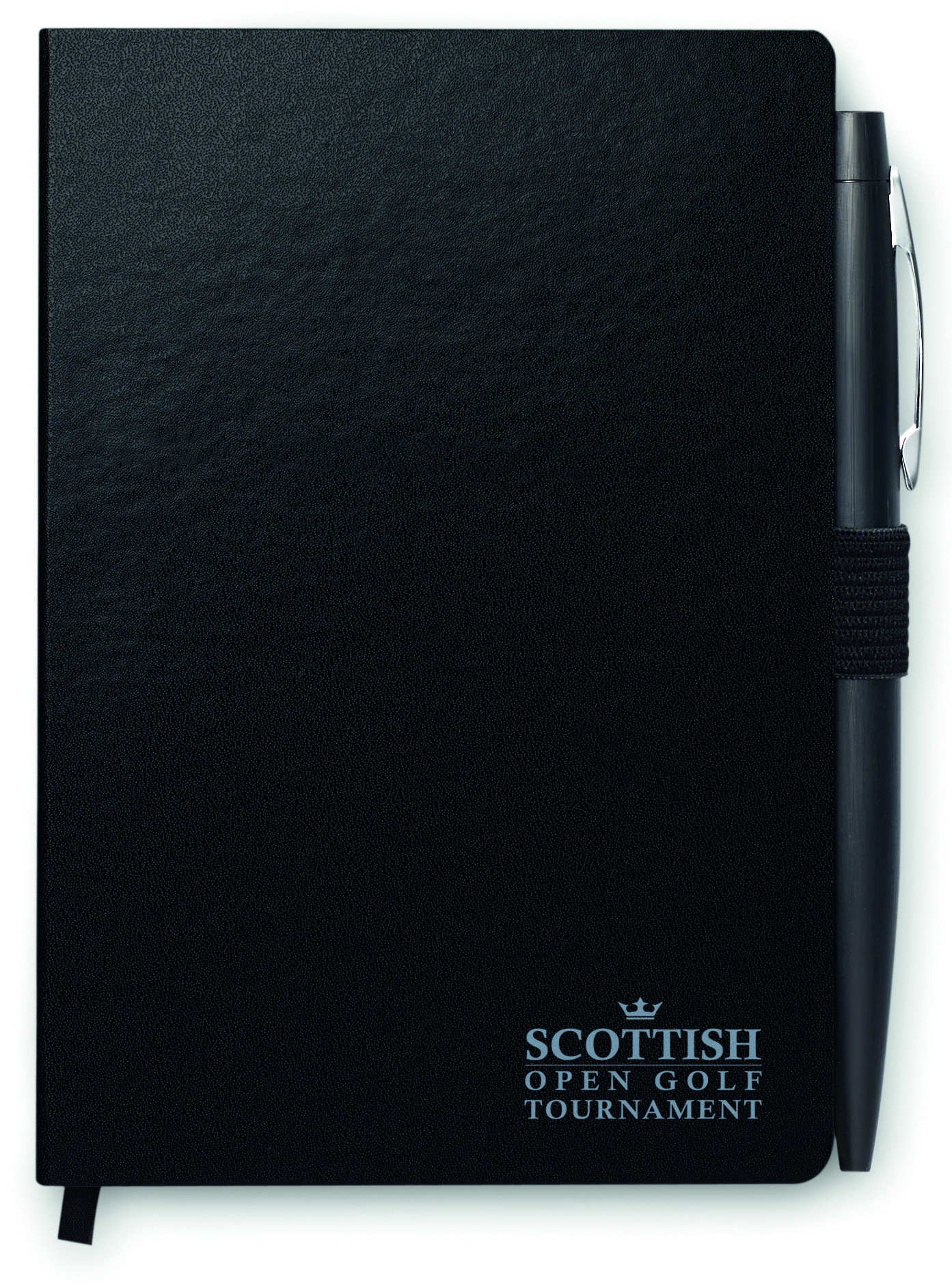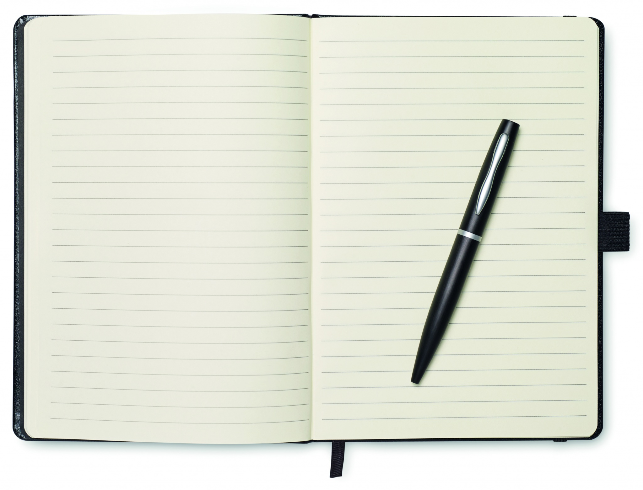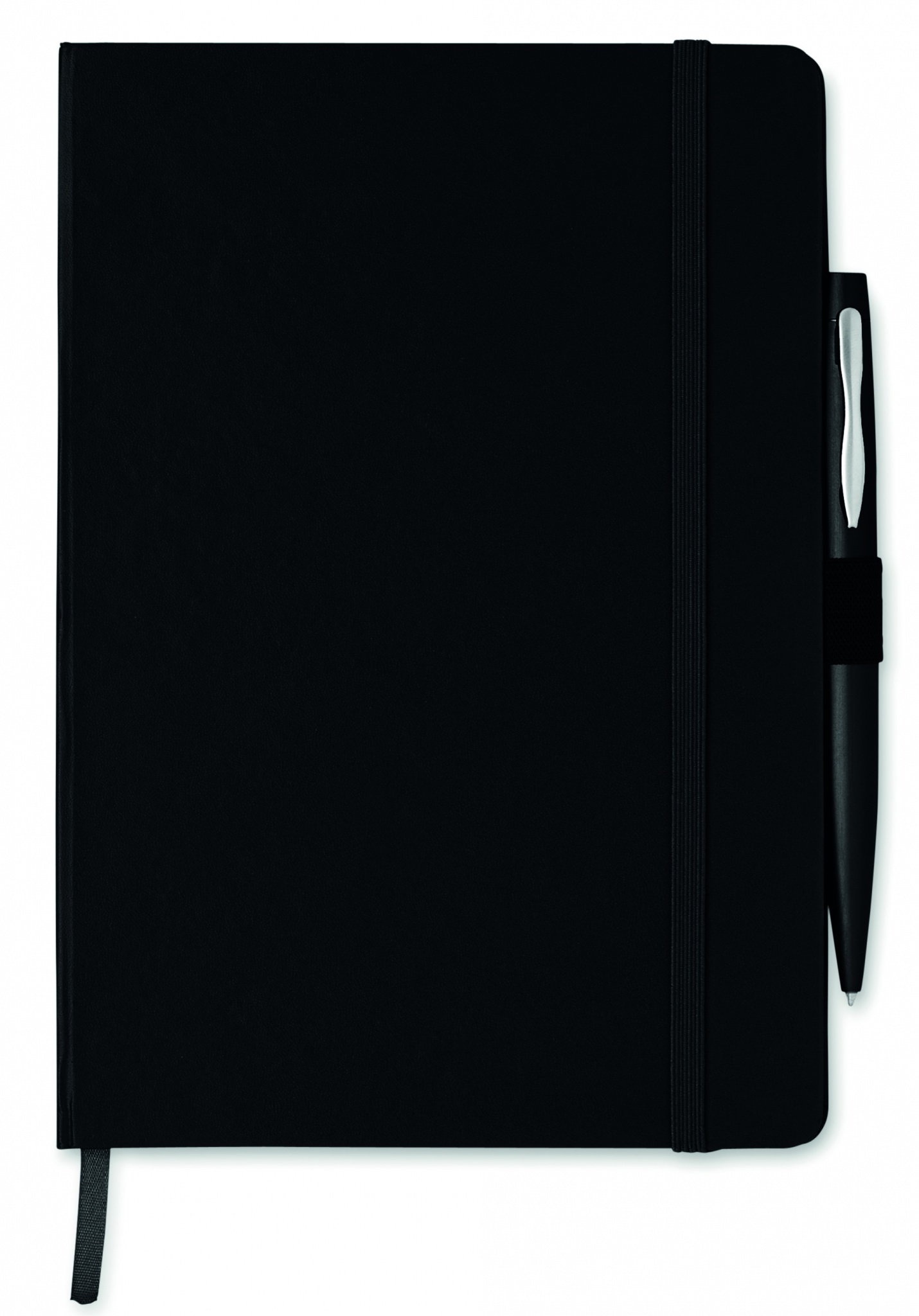 A5 notebook with pen. Hard PU cover. Casebound. 144 lined pages (72 sheets). Matching elastic closure strap, ribbon bookmark and pen holder. Matching metal push button ball pen. Blue ink.
