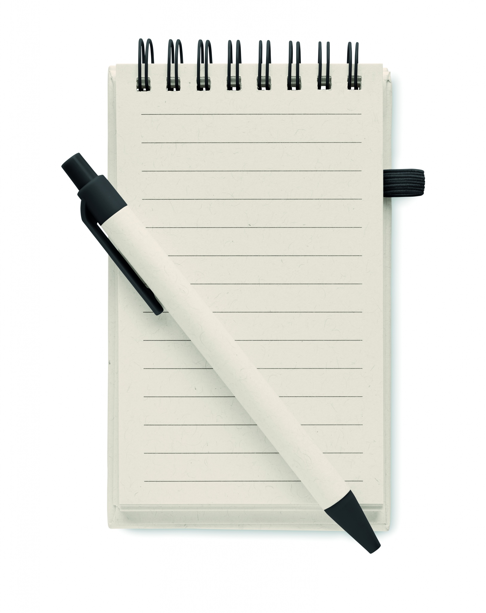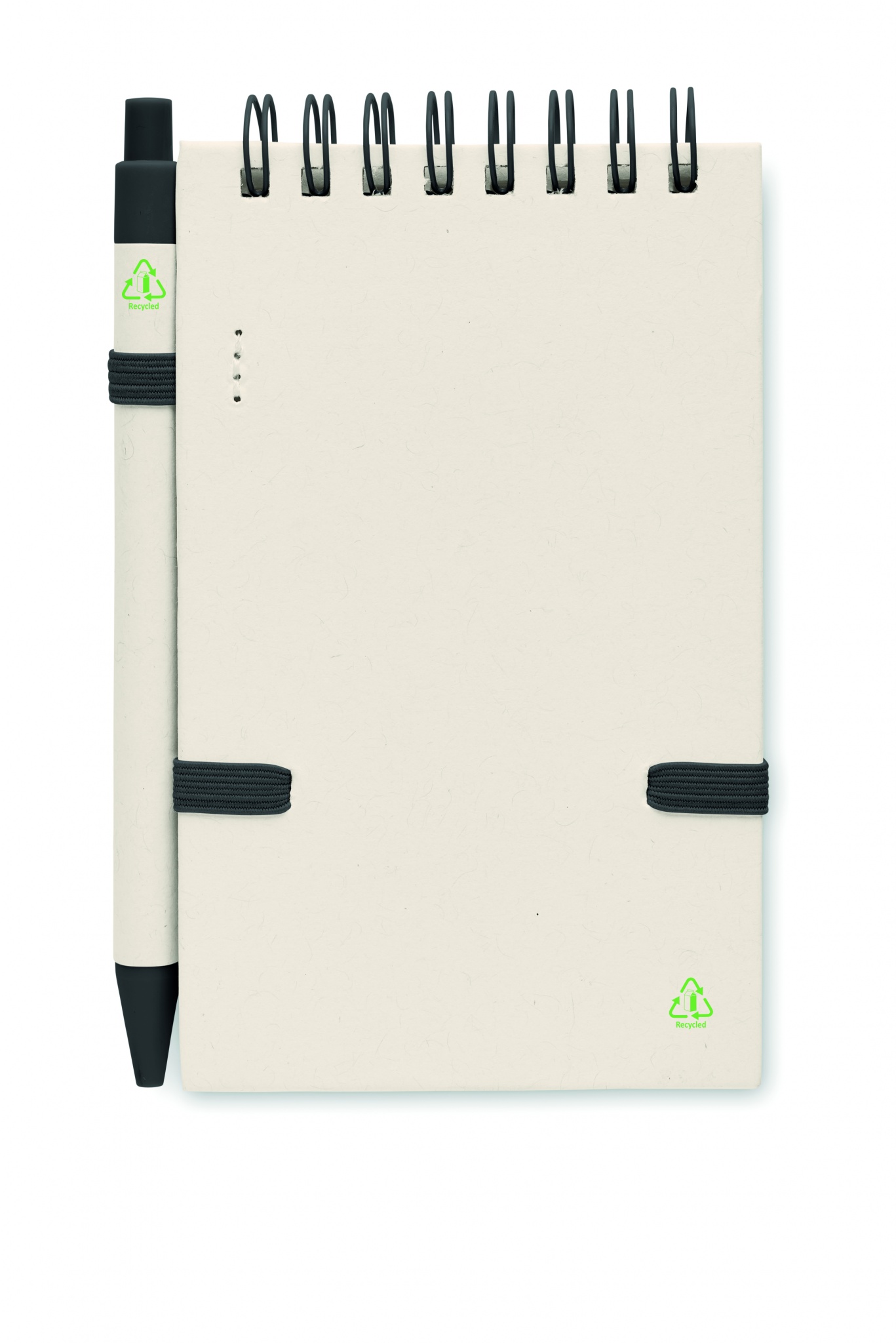 A6 Recycled milk cartons 70 sheet recycled lined paper notebook (70 % recycled milk carton and 30% recycled paper) with matching pen. Ring bound. Matching push button ball pen. Blue ink. Elastic closure strap and pen holder.