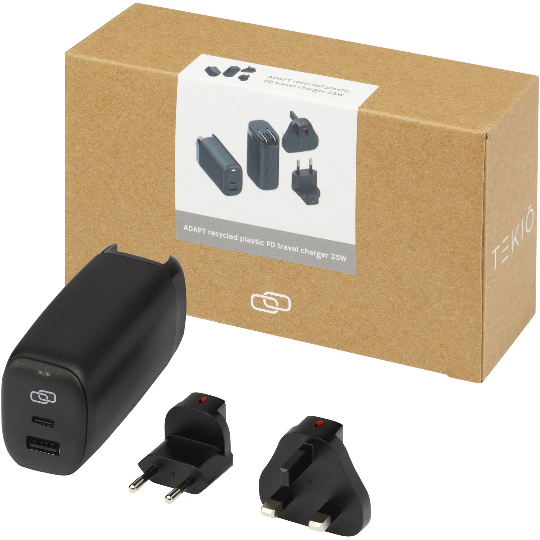 The ADAPT recycled plastic PD travel charger is a compact and environmentally friendly charging solution designed to keep you powered up in style while on the go. With its recycled plastic housing and copper and nickel plated components, this charger offers both durability and sustainability. The charger comes with US, EU and UK plusg, allowing you to use it in various regions with ease. The built-in transformer ensures seamless power conversion for international travel (AC 100-240V 50/60Hz). This travel charger comes with 2 ports (Type-C and USB A) that offer versatile and superfast charging options, and the PPS (Programmable Power Supply) feature allows for adaptive charging. Delivered in a premium kraft paper box with a colourful sticker.
