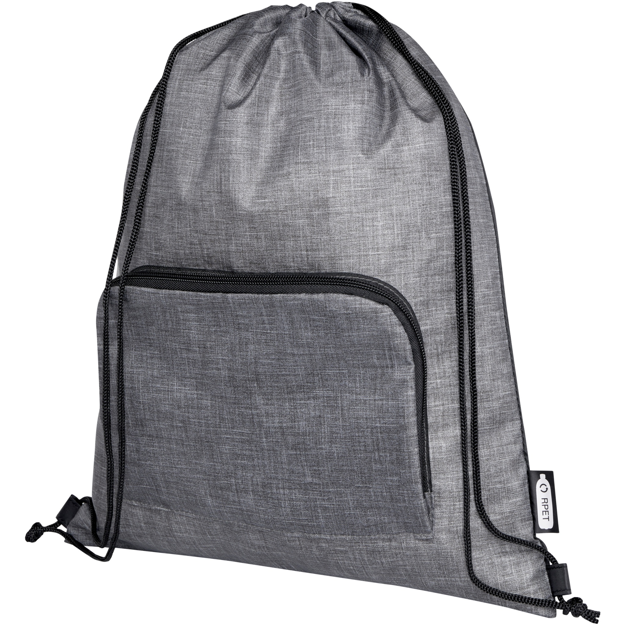 The Ash foldable recycled drawstring bag features a main compartment with cinch closure, and a zippered front pocket that the bag can easily fold up into for easy transport and storage.