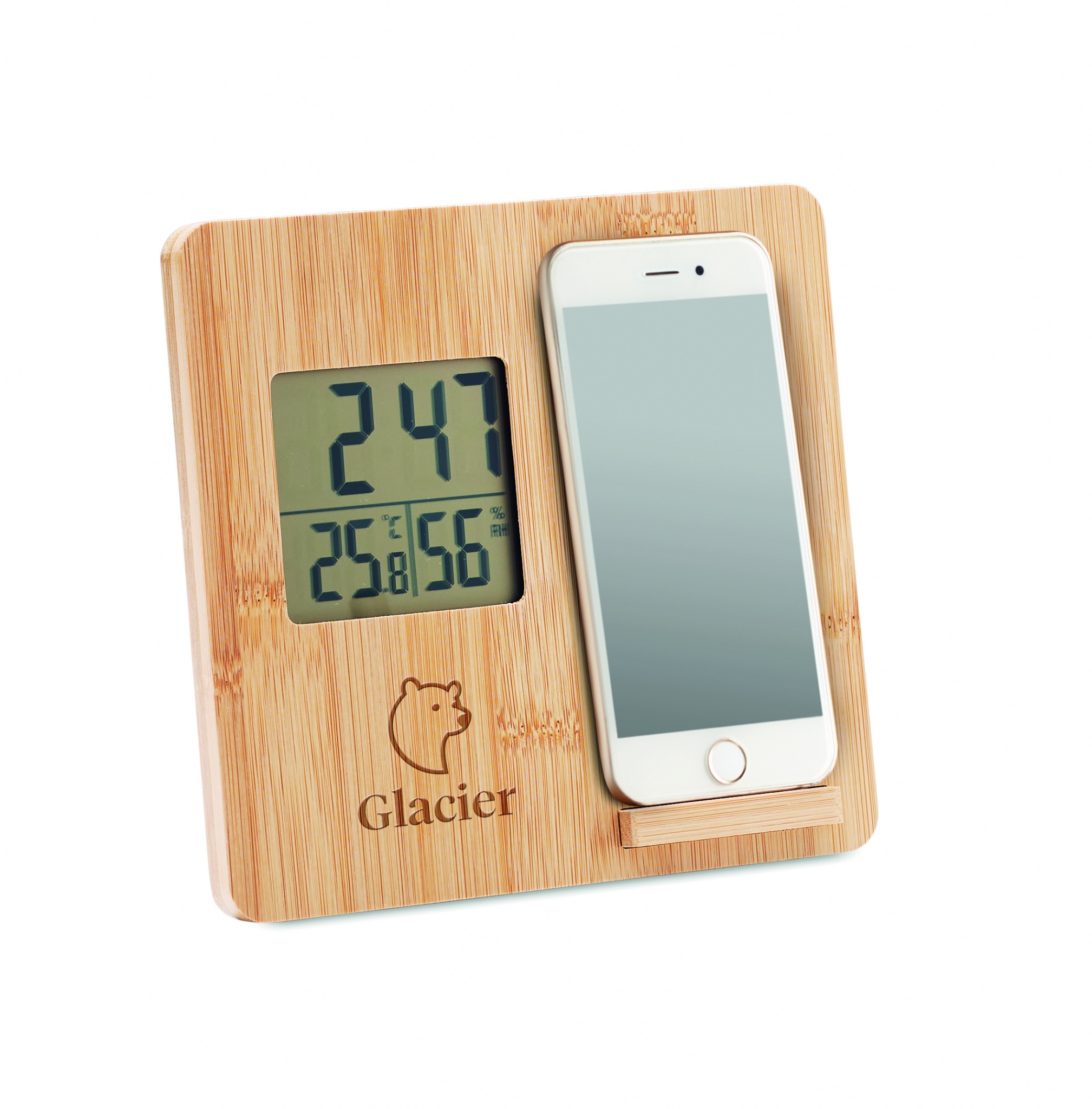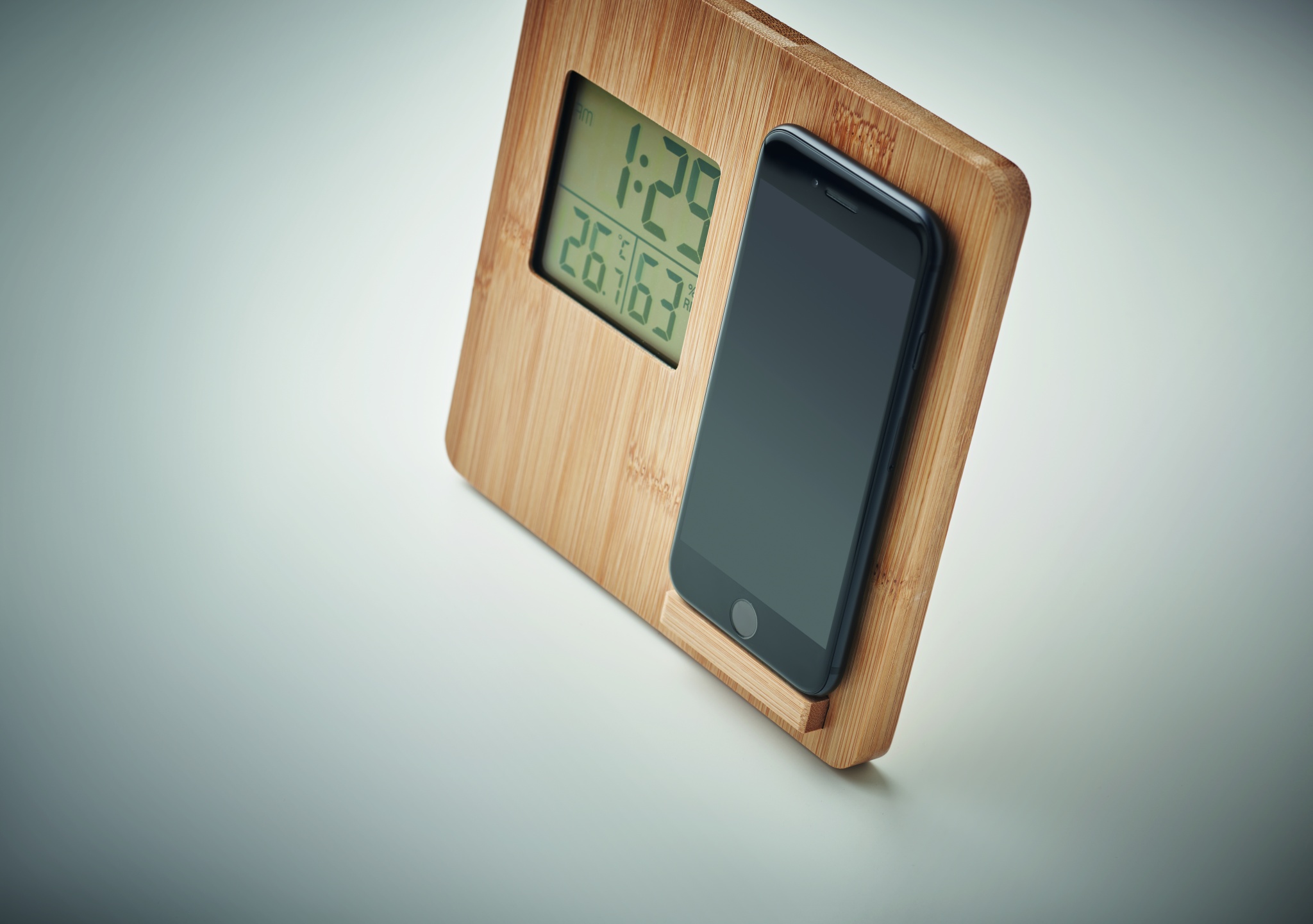 10W Wireless charger device including time, temperature and humidity display, smartphone stand function in bamboo casing. 1 CR2032 included. Wireless output: DC 9V/1.10A (10W) for quick charging. Compatible latest androids, iPhone® 8, X and newer. Bamboo is a natural product, there may be slight variations in colour and size per item, which can affect the final decoration outcome.