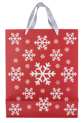 Large christmas gift bag made of paper with snowflake design and two handles. We will print your logo on a label.