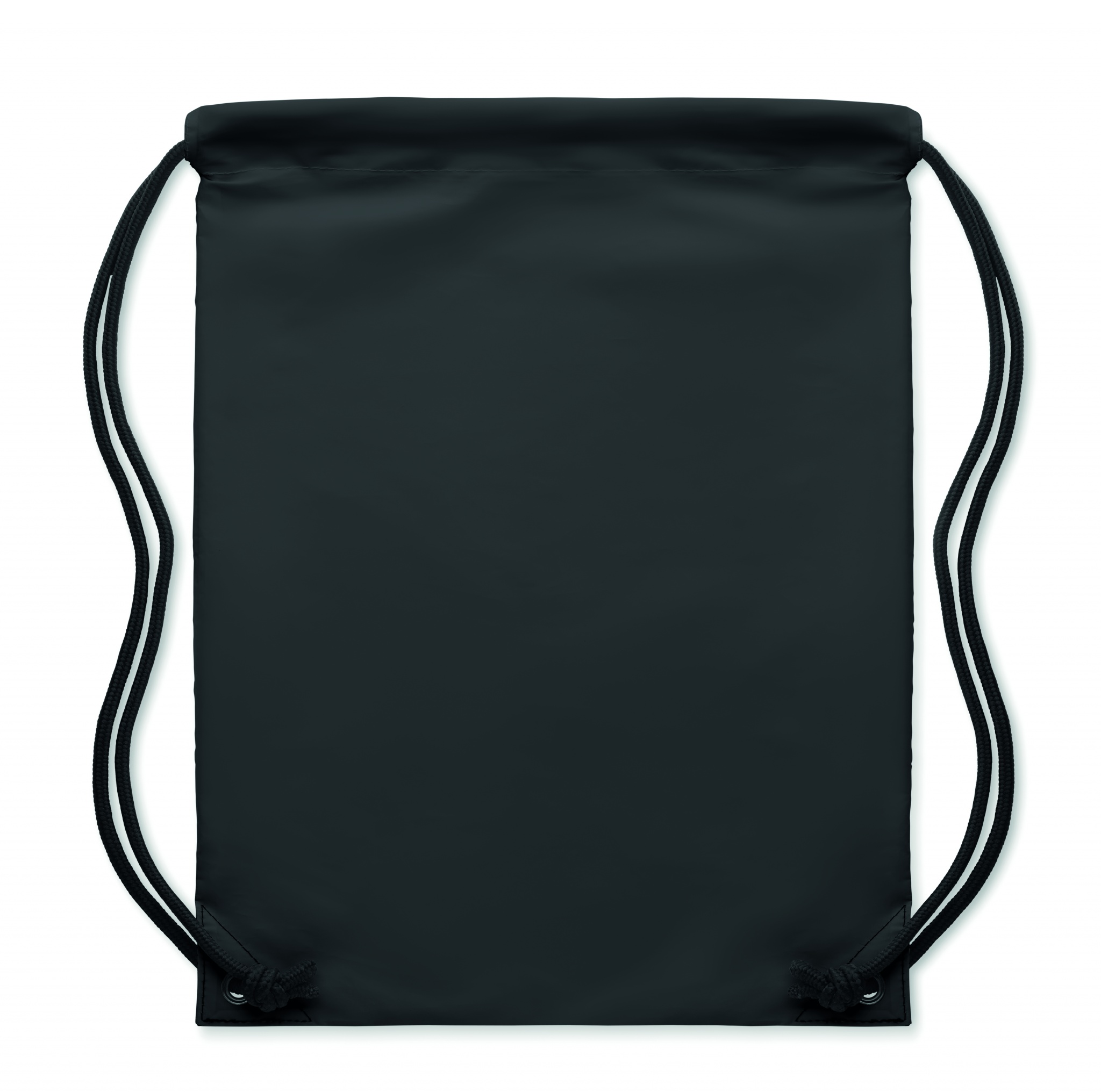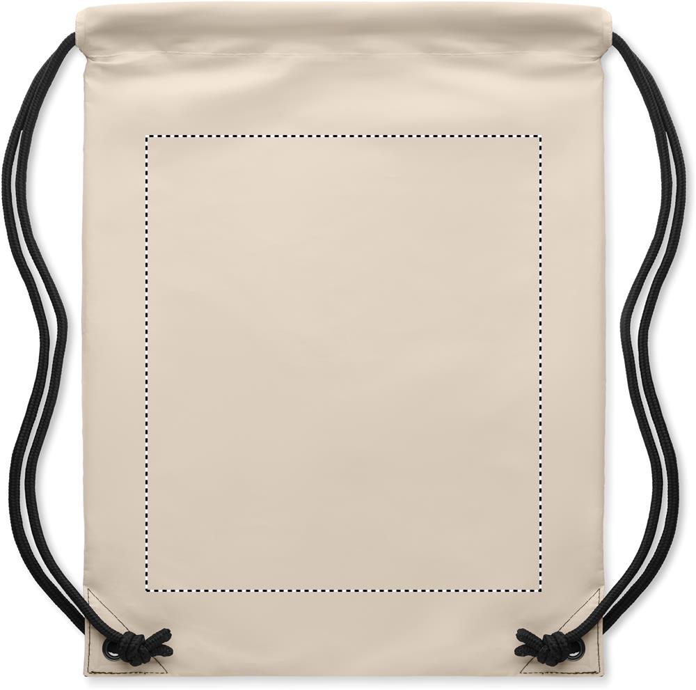 Drawstring bag in 190T polyester coated with with reflective granules. Includes zippered pocket on one side. Thick cord.