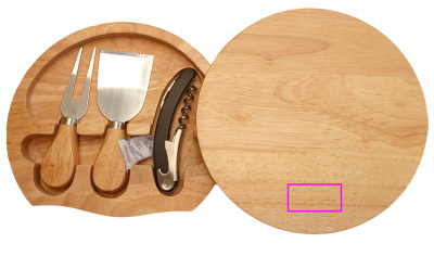 Cheese board made of wood (rubberwood),includes a cheese knife, a cheese fork, and a waiter's knife. We engrave your logo on the board.