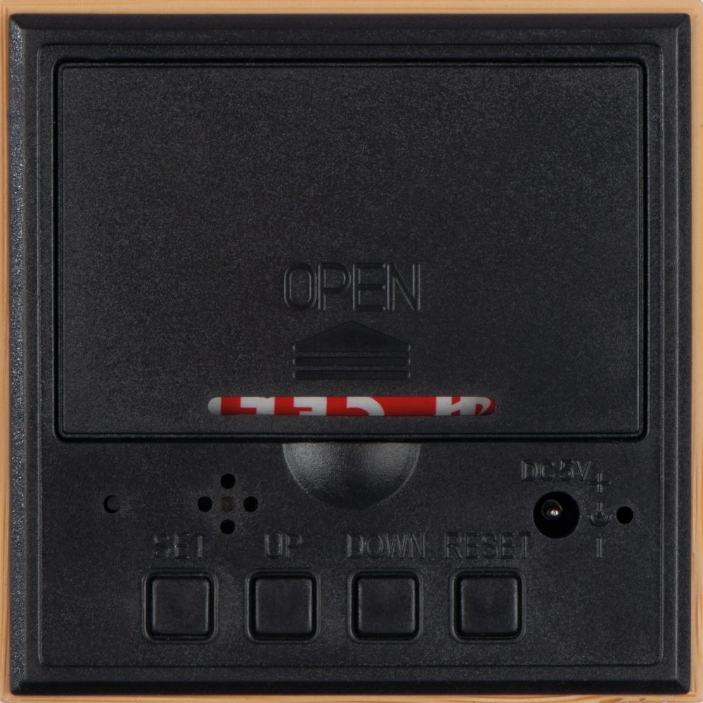 Elegant desk clock with wooden coating, black display space and blue LED letters, showing time, date and temperature by turns. Your logo will be engraved onto the top.