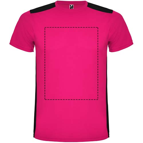Easy-dry, technical and breathable fabric. Crew neck. Combination of two polyester fabrics on the back and shoulders. Bird's eye fabric on front and breathable 3D mesh fabric at the back. Fabric prepared for moisture absorption. Decorative zigzag backstitch on sides and shoulders. Back pattern slightly longer. Removable label.