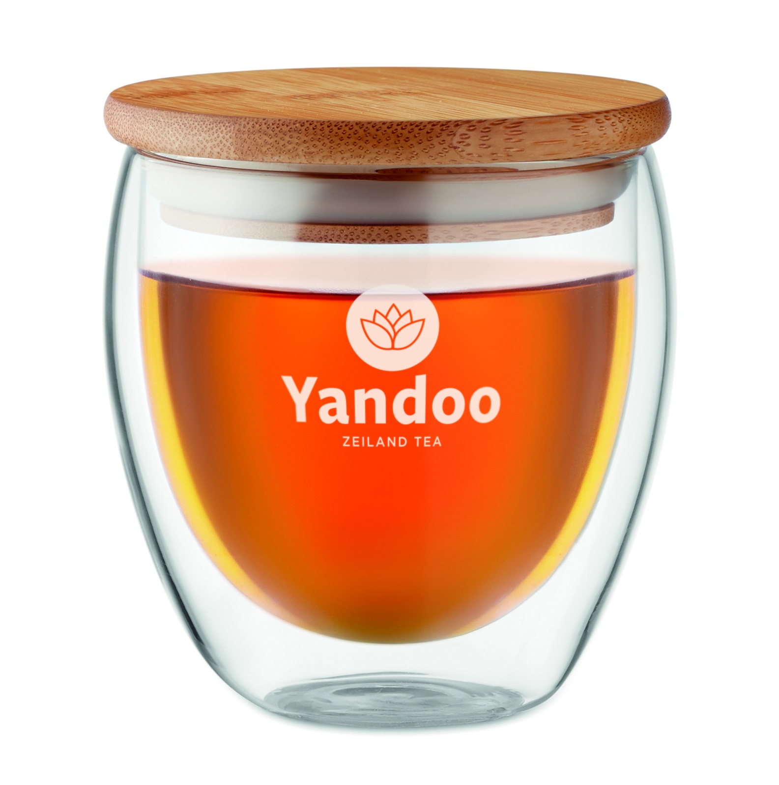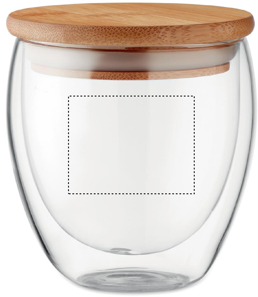 Double wall high borosilicate glass with bamboo lid with silicone ring. Capacity 250 ml. Bamboo is a natural product, there may be slight variations in colour and size per item, which can affect the final decoration outcome.