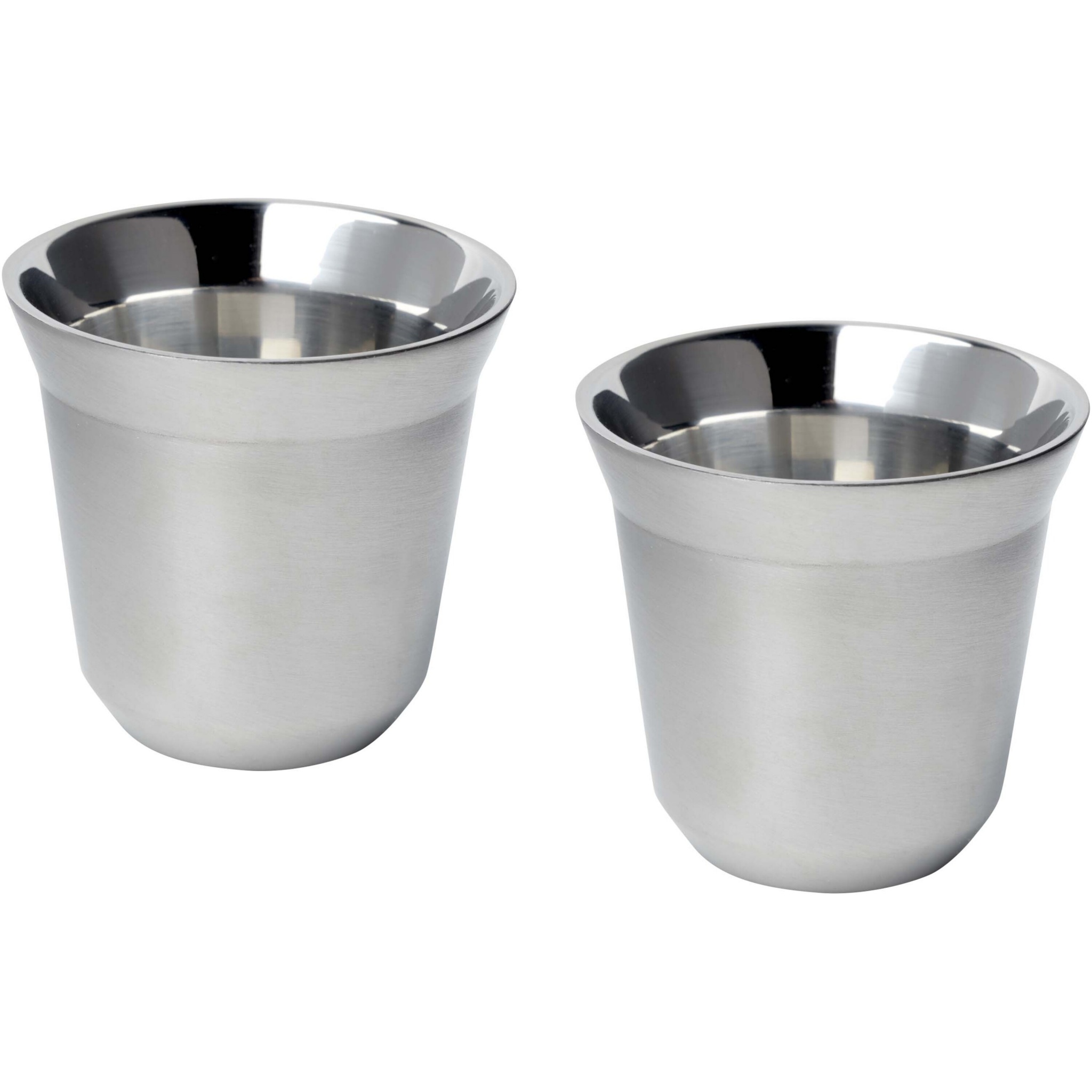 Set of 2 double walled RCS certified stainless steel espresso cups. Volume capacity 80 ml. Delivered in a recycled cardboard gift box.