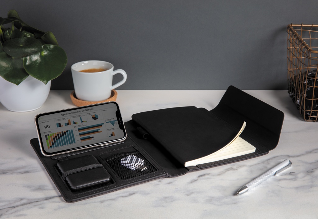 Stay organised and efficient with this beautiful A5 wireless portfolio! It offers wireless-charging capability so that you are always connected. The included external powerbank can be used on its own as well. This sleek portfolio features a built-in wireless charging phone stand, elastic pen loop and additional mesh pockets. The notebook includes 64 sheets/128 pages of 70 gsm cream-coloured lined paper. Made with polyester and PU. Input: 5V/2A; Output:5V/2A. Wireless input 5V/2A, Output 5V/1A. Comes in full colour gift box.