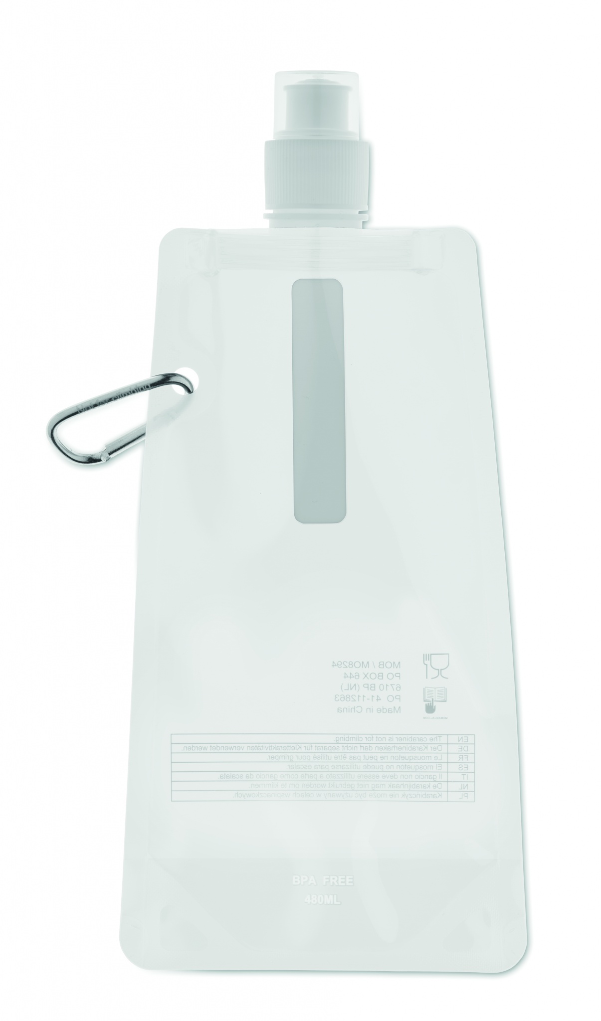 Foldable water bottle in PET which is BPA free with aluminium carabiner. Capacity 480 ml. Leak free.