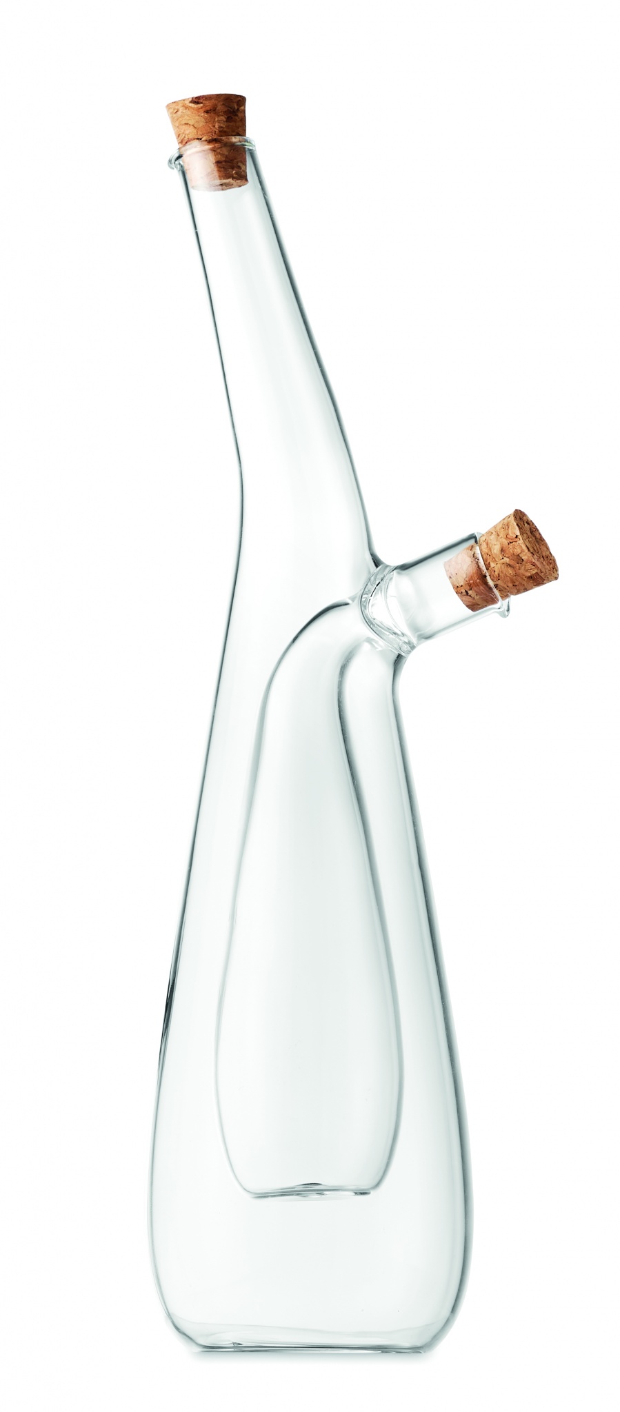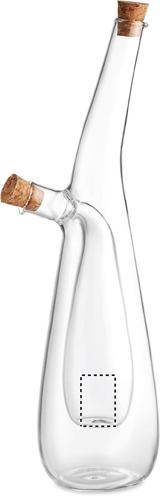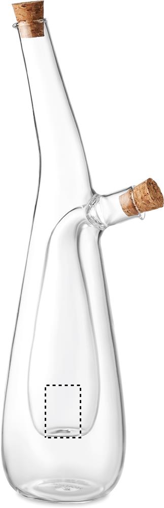 Borosilicate glass oil and vinegar bottle with cork stoppers. Capacity outer: 300 ml. Capacity inner: 80 ml. Cork is 100% natural material. Due to its structural nature and surface porosity the final print result per item may have deviations.
