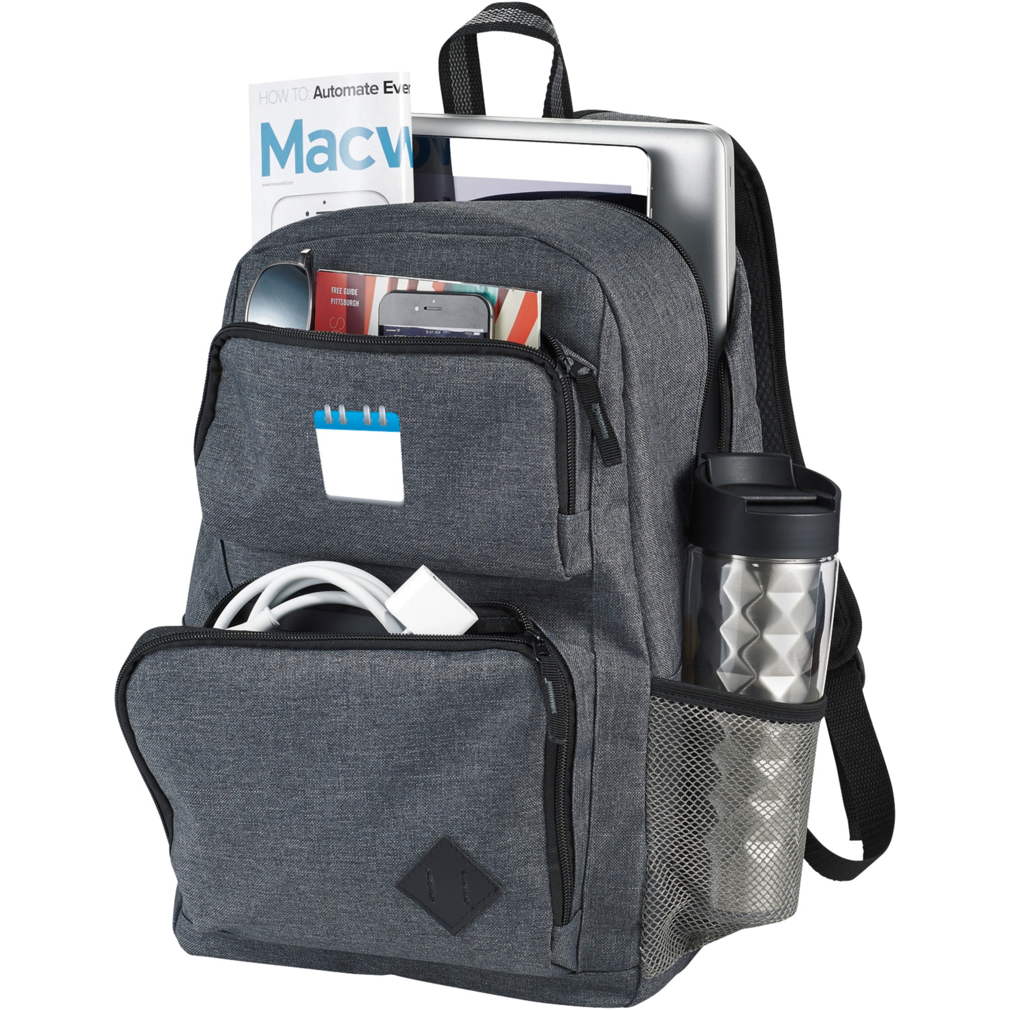 Zipped main compartment with padded laptop sleeve holds up most 15.6" laptops and has a dedicated tablet pocket with room for all your other business essentials. The two front pockets offer flexible decorating locations and are large enough for power banks, cables, and other essentials. The side pocket offers additional storage. Adjustable padded backpack straps and top grab handle. There may be minor variations in the colour of the actual product due to the nature of the fabric dyes, weaves, and printing.