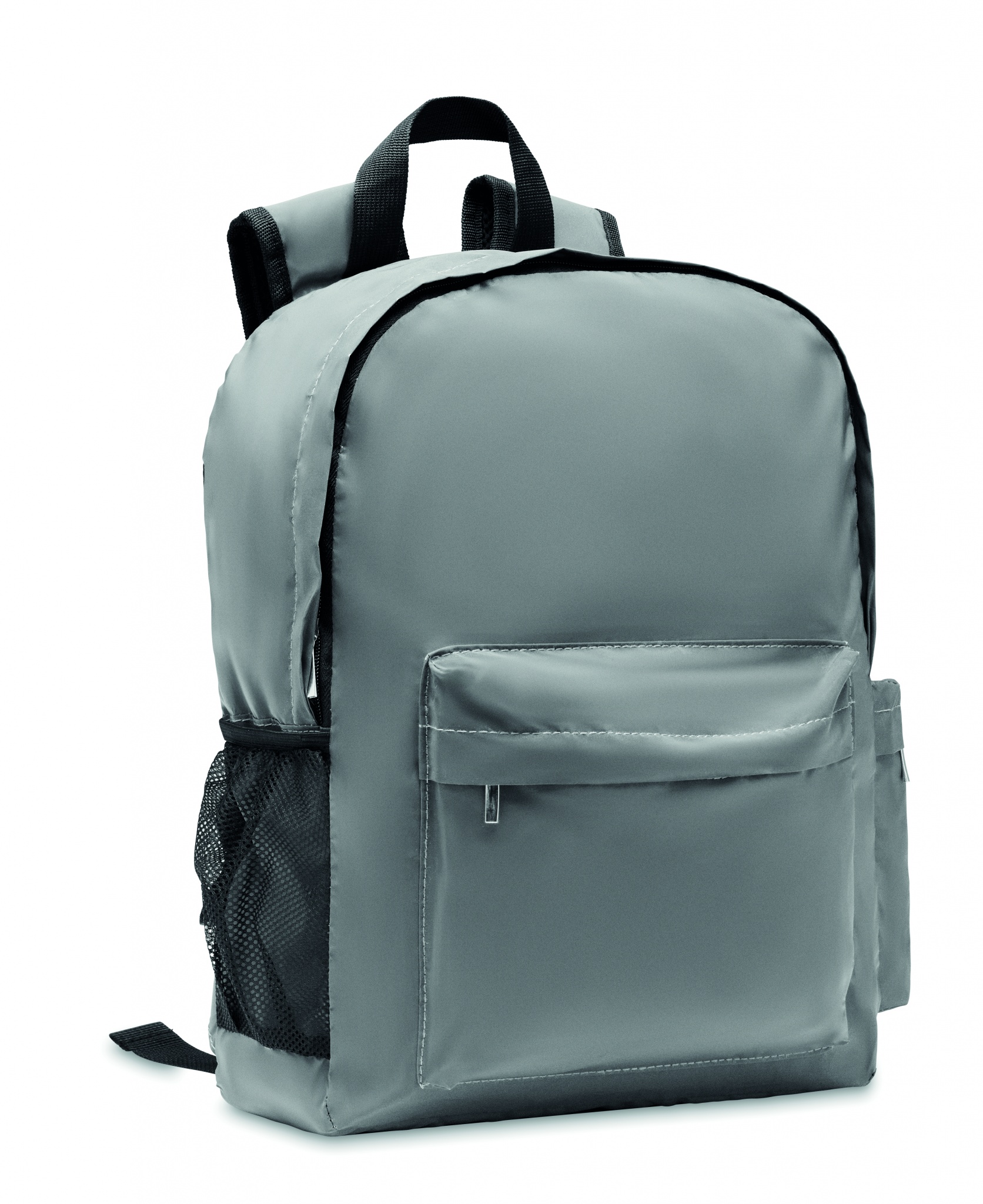 Backpack in high reflective 190T polyester and straps. It has 15 inch padded laptop compartment. Front zippered pocket, one side mesh pocket and other side zippered pocket. For comfort a padded back section in 600D recycled polyester.