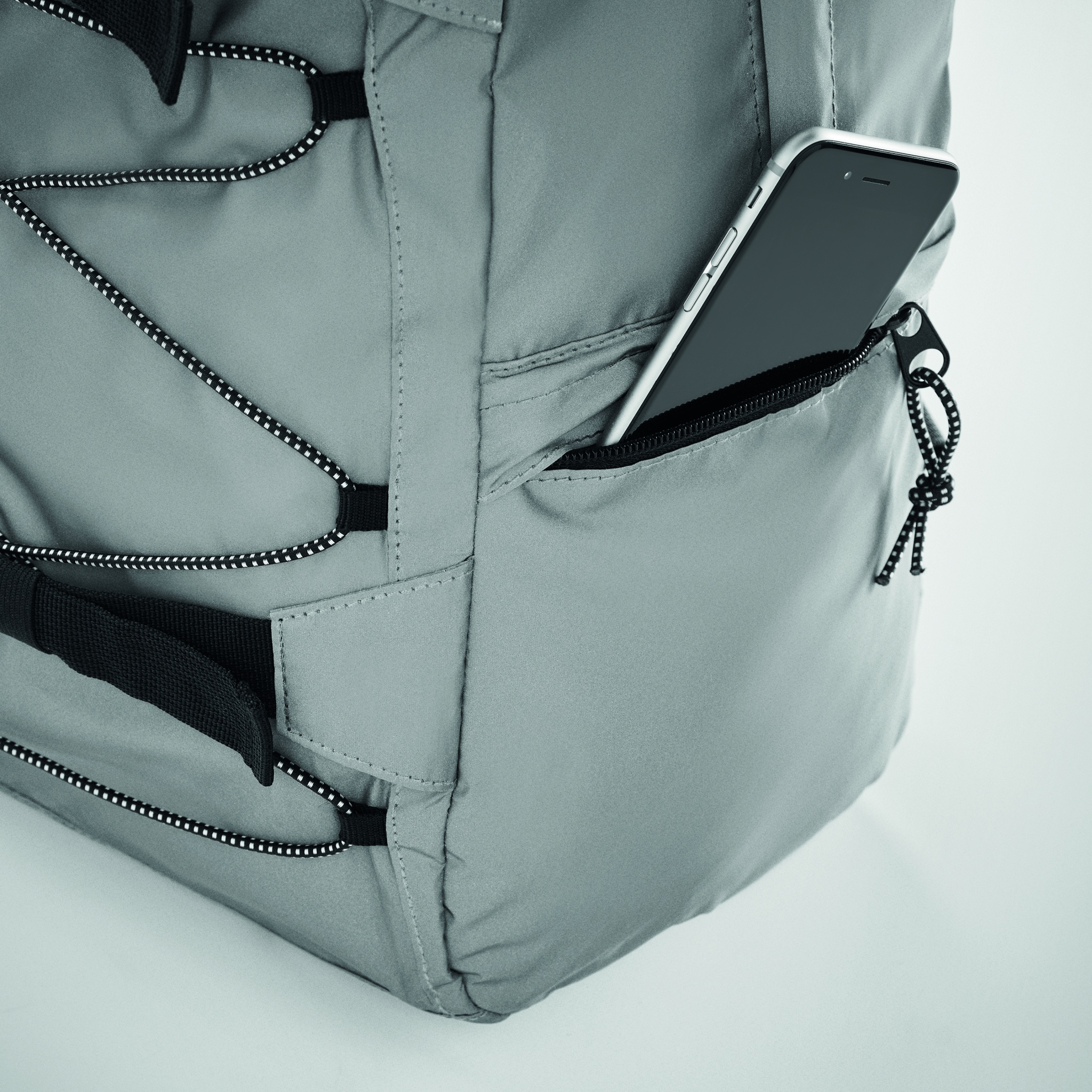 Backpack in high reflective 190T polyester with cord on front. Padded back, straps and bottom. It has 15 inch laptop compartment. One side mesh pocket and other side zippered pocket.