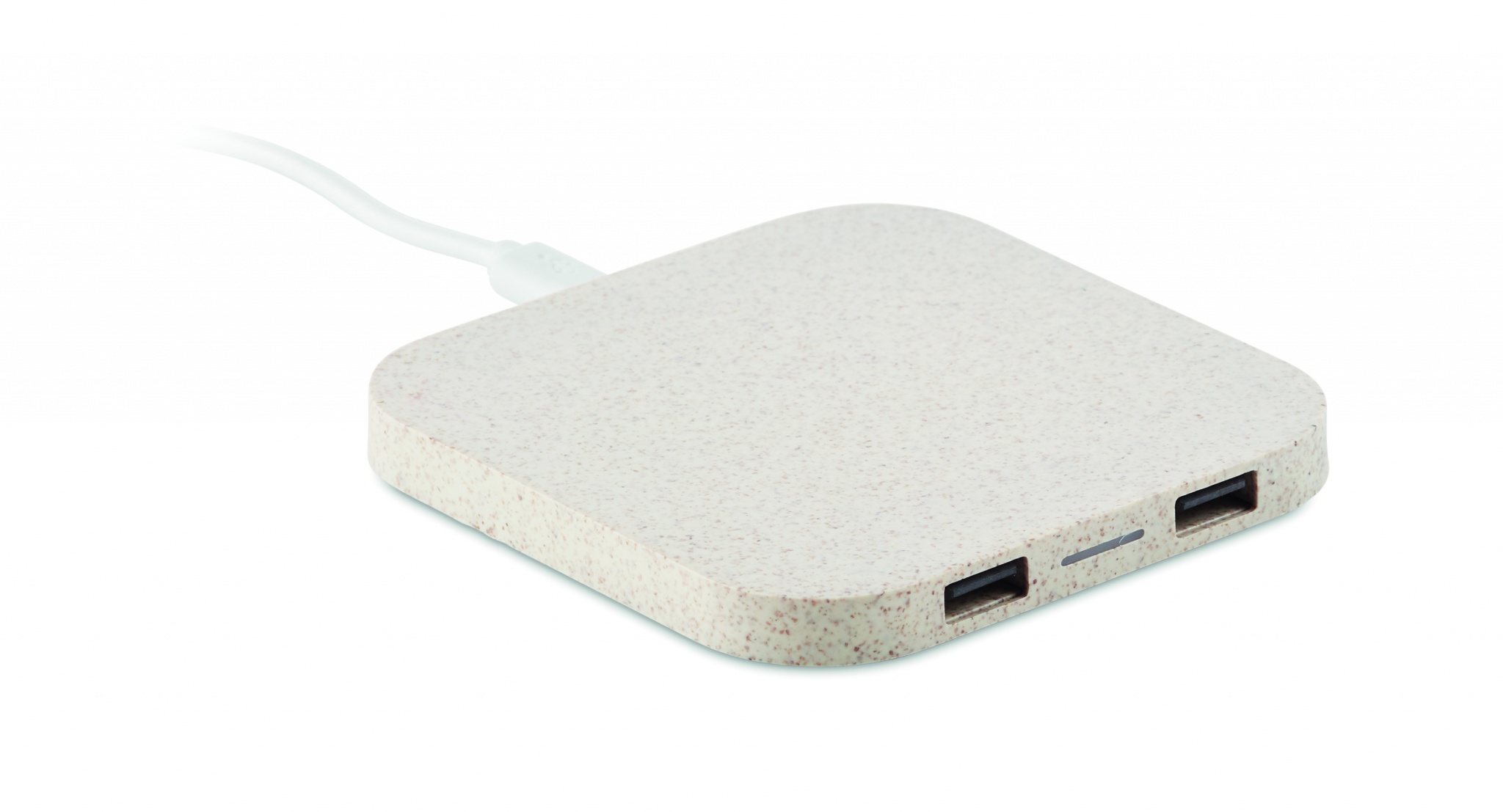 Wireless charging pad in wheat straw (35%) and ABS (65%) with 2 port 2.0 USB hubs. Output DC5V/1A (5W). Compatible latest androids, iPhone® 8, X and newer.