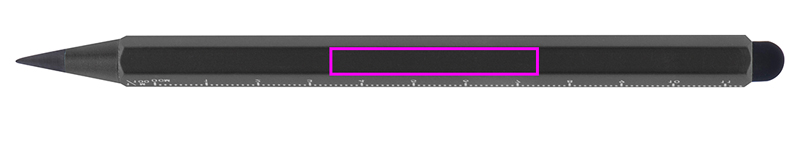 Aluminum inkless pen with touch function and scale in cm and inch. The lead is made of a mixture on graphite and metal, which makes it extremely durable. Your logo will be engraved on the free space on the barrel.