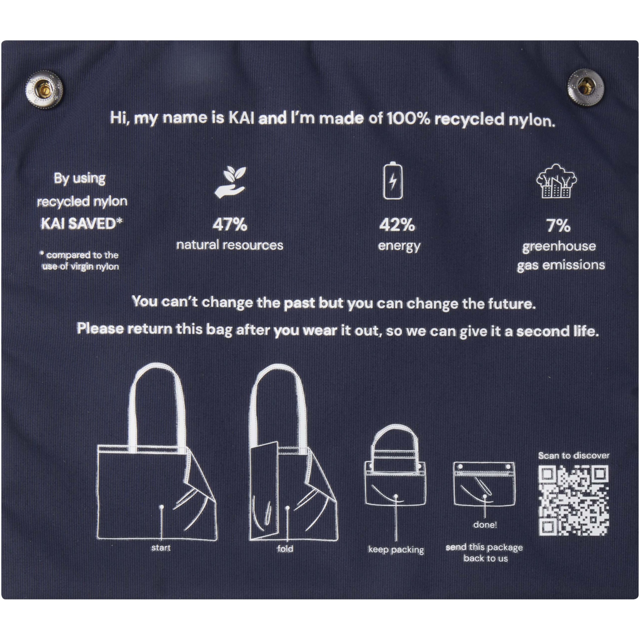 The Kai GRS recycled circular tote bag – the biggest positive impact maker in terms of environmental performance. More sustainable exploration starts with better design – a design with less impact on the environment. The total average reduction in impact already made with 1 bag is as follows: 7% carbon footprint, 42% energy and 47% eco costs. Made from 200T GRS certified recycled nylon, the Kai is a classic and timeless tote bag that is suitable to use on a daily basis. The designated spot for printing is on the pocket that doubles as pouch. The bag can be returned via a take-back program featuring a QR code that provides additional information.