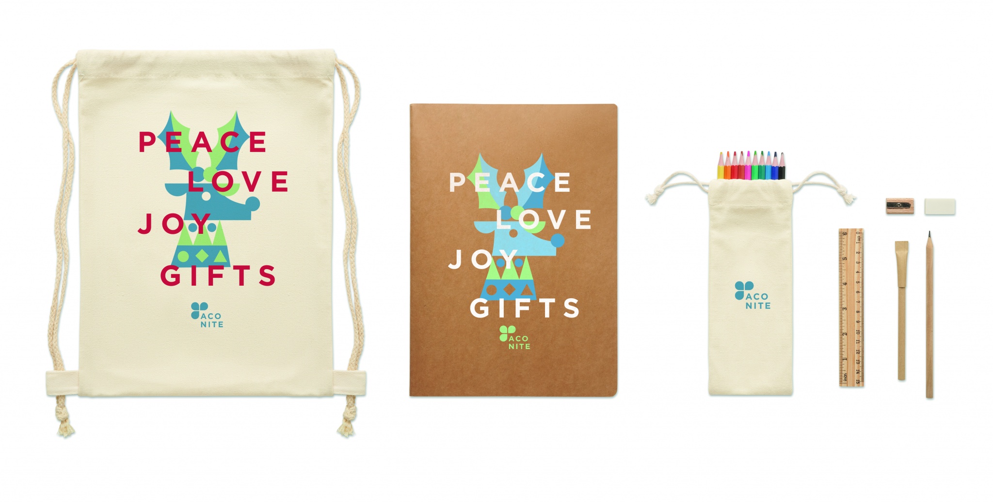 Kids drawing and 5 piece stationery set including wooden ruler, wooden sharpener, eraser, wooden pencil and cardboard ball pen. Additional 10 colouring pencils, A4 recycled paper 50 plain sheets (100 pages). Presented in cotton drawstring bag.