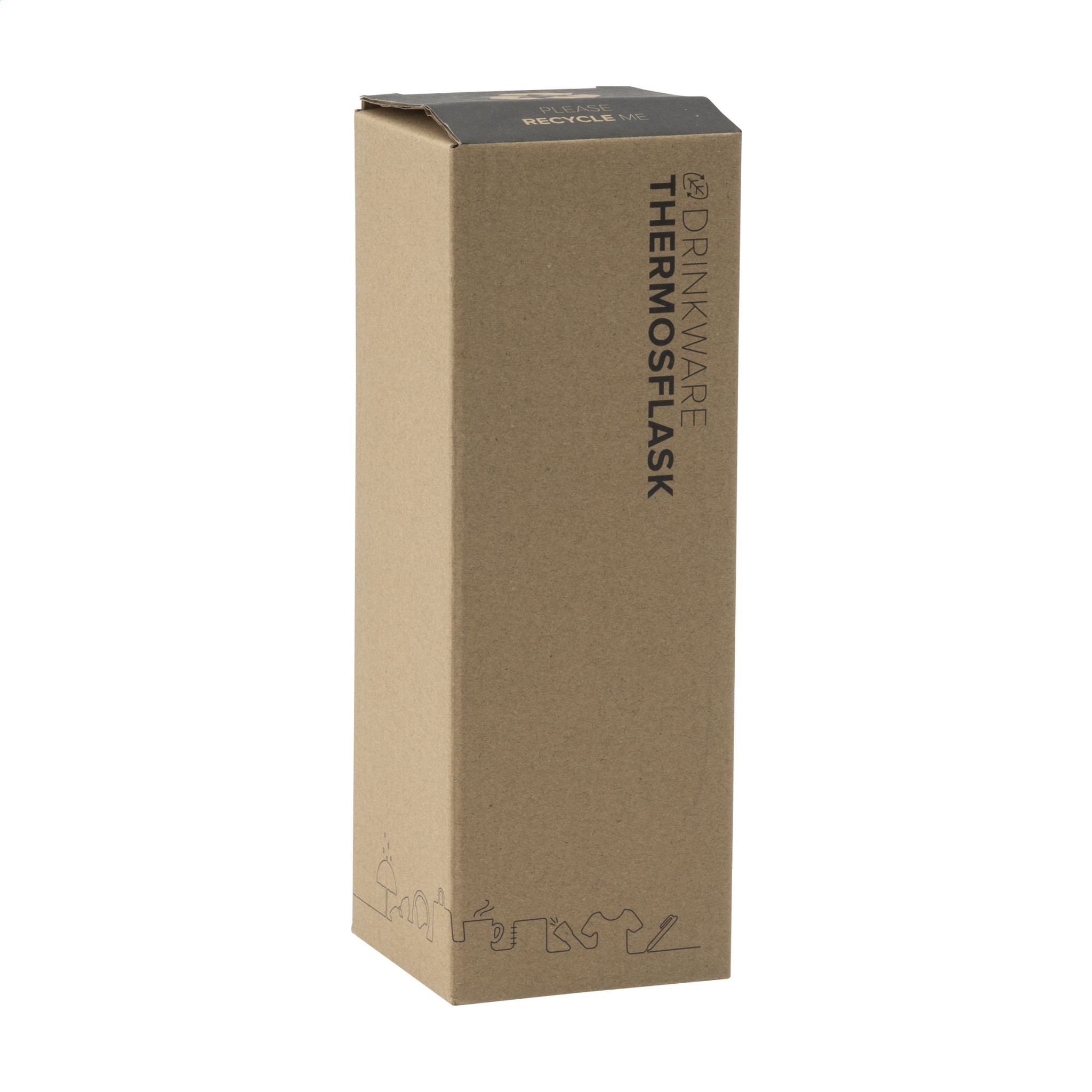 Double-walled, leak proof stainless-steel water bottle / thermos bottle fitted with a bamboo screw cap. Vacuum insulated. Suitable for keeping hot or cold drinks at a consistent temperature. Capacity 500 ml. Each item is supplied in an individual brown cardboard box.