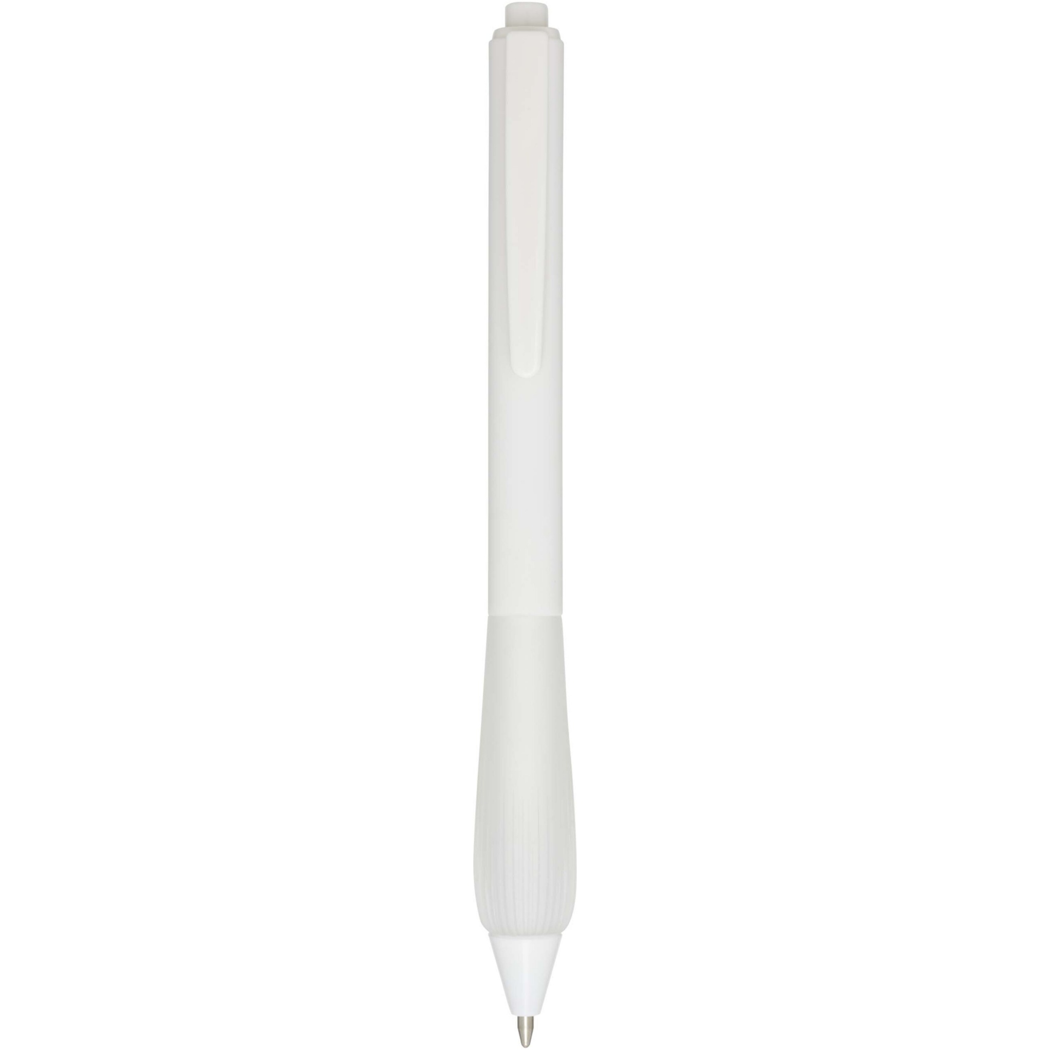 Recycled plastic ballpoint pen with a rubberized barrel, and grip made of TPR. Ink colour: Blue. Writing length: 1000 metres. Nib size: 1.0 mm.