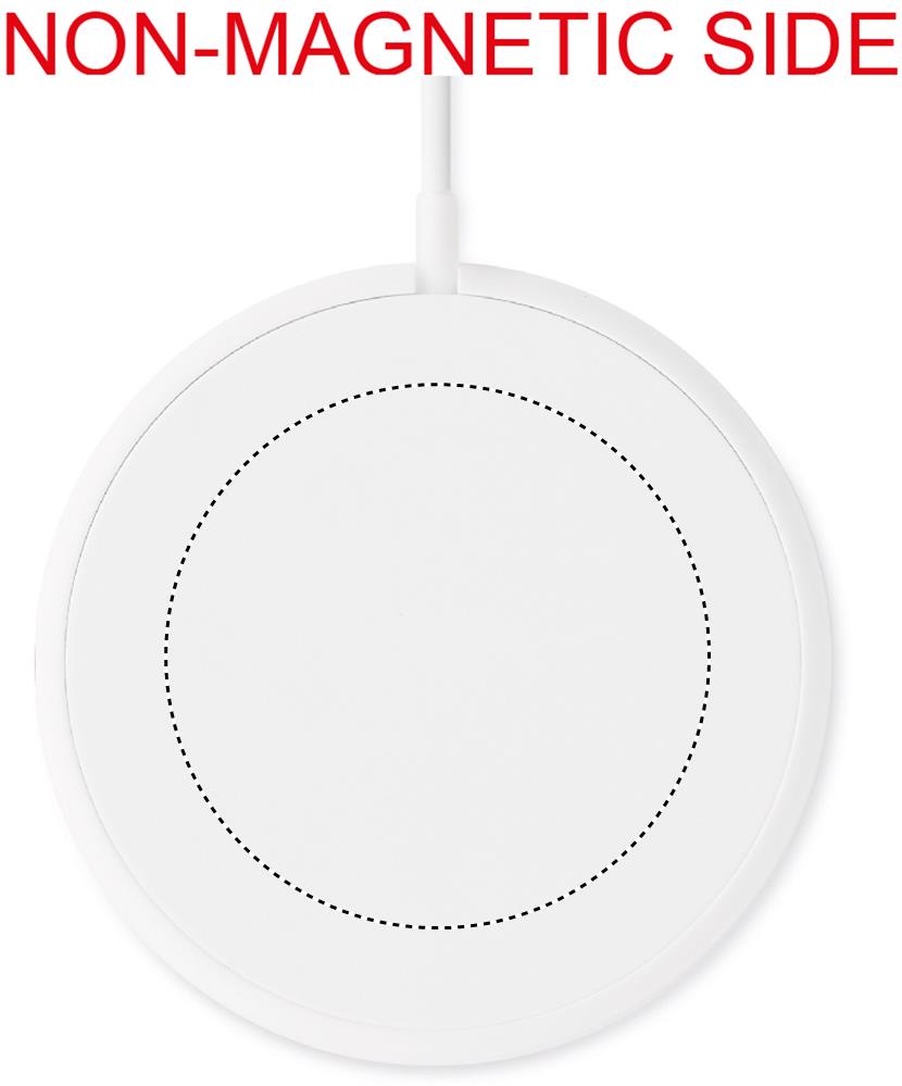 Magnetic wireless charger in ABS. Output: DC 9V/1.1A (10W) for quick charging. Compatible with iPhone® 12 and newer. Including additional magnetic metal ring to support charging of other non-magnetic wireless chargeable phones.