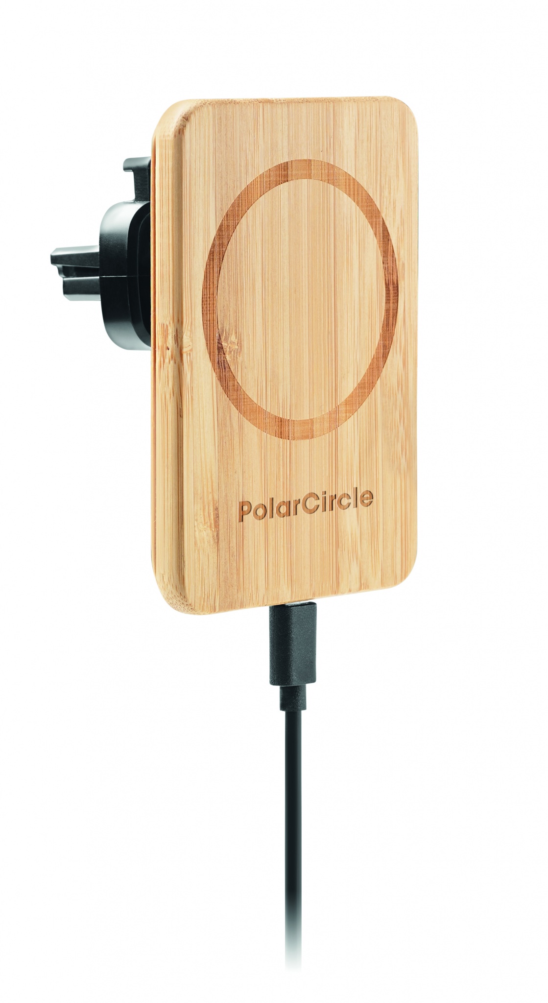 Magnetic bamboo wireless charger with car mount. Output: DC 9V/1.67A (15W) for quick charging. Compatible with iPhone® 12 and newer. Including additional magnetic metal ring to support charging of other non-magnetic wireless chargeable phones. Bamboo is a natural product, there may be slight variations in colour and size per item, which can affect the final decoration outcome.