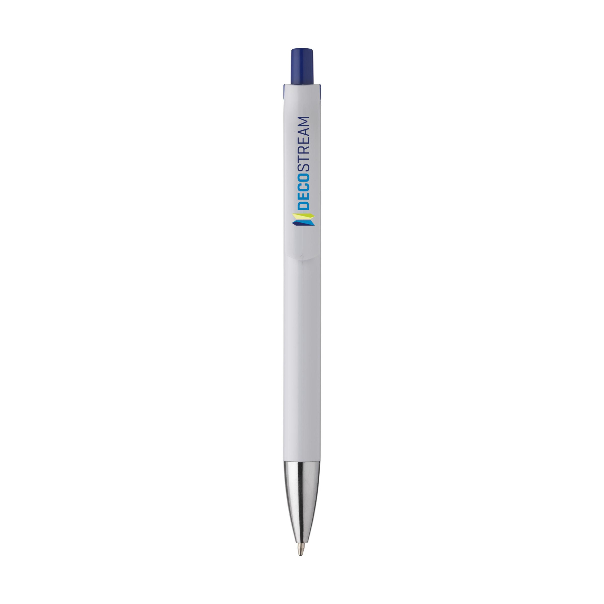 Blue ink ballpoint pen with stylish design: the body and clip of this pen are integrated. Striking colour accent below the clip. This accent colour matches the colour of the push button.