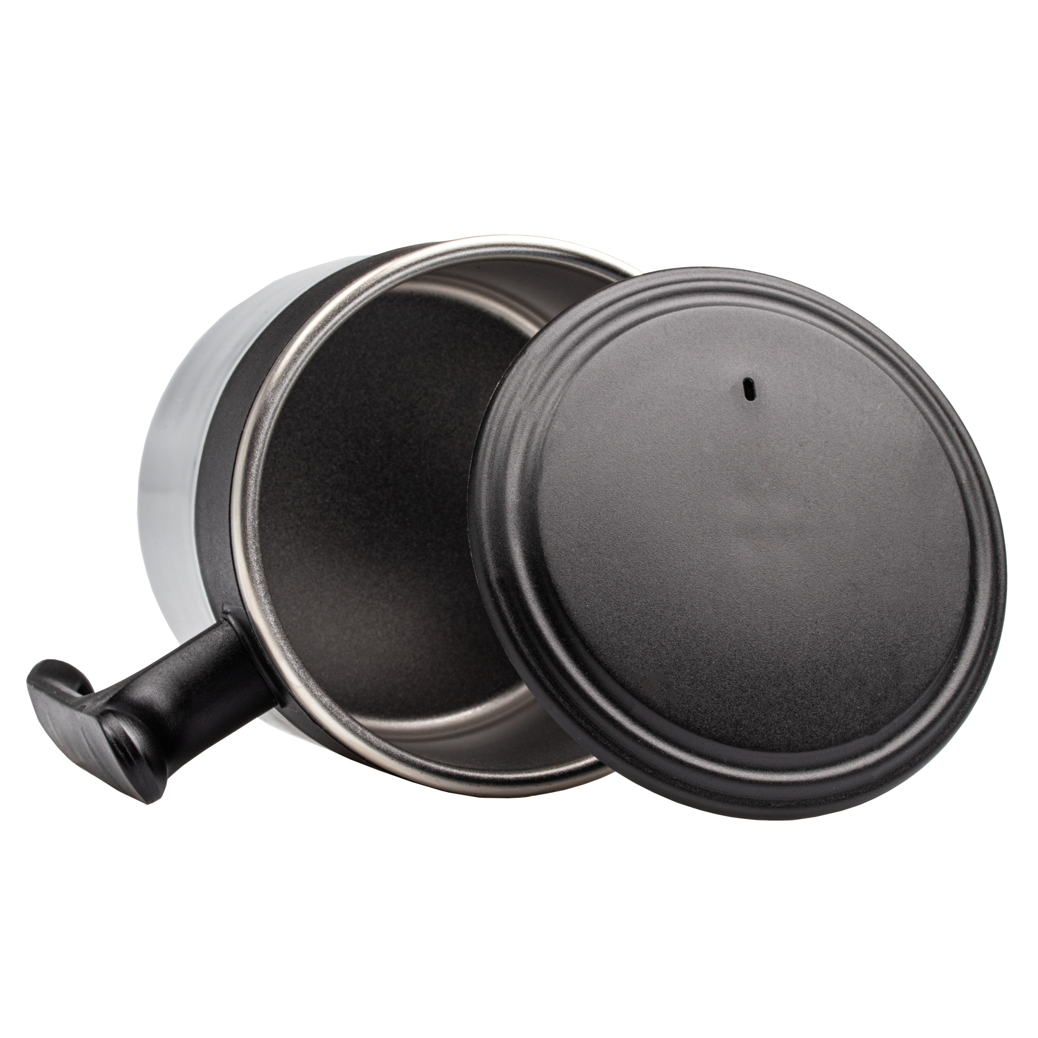 Double-walled drinking cup made of stainless steel with non-slip bottom, handle and a filling capacity of 300 ml. Your logo will be printed on the mug.
