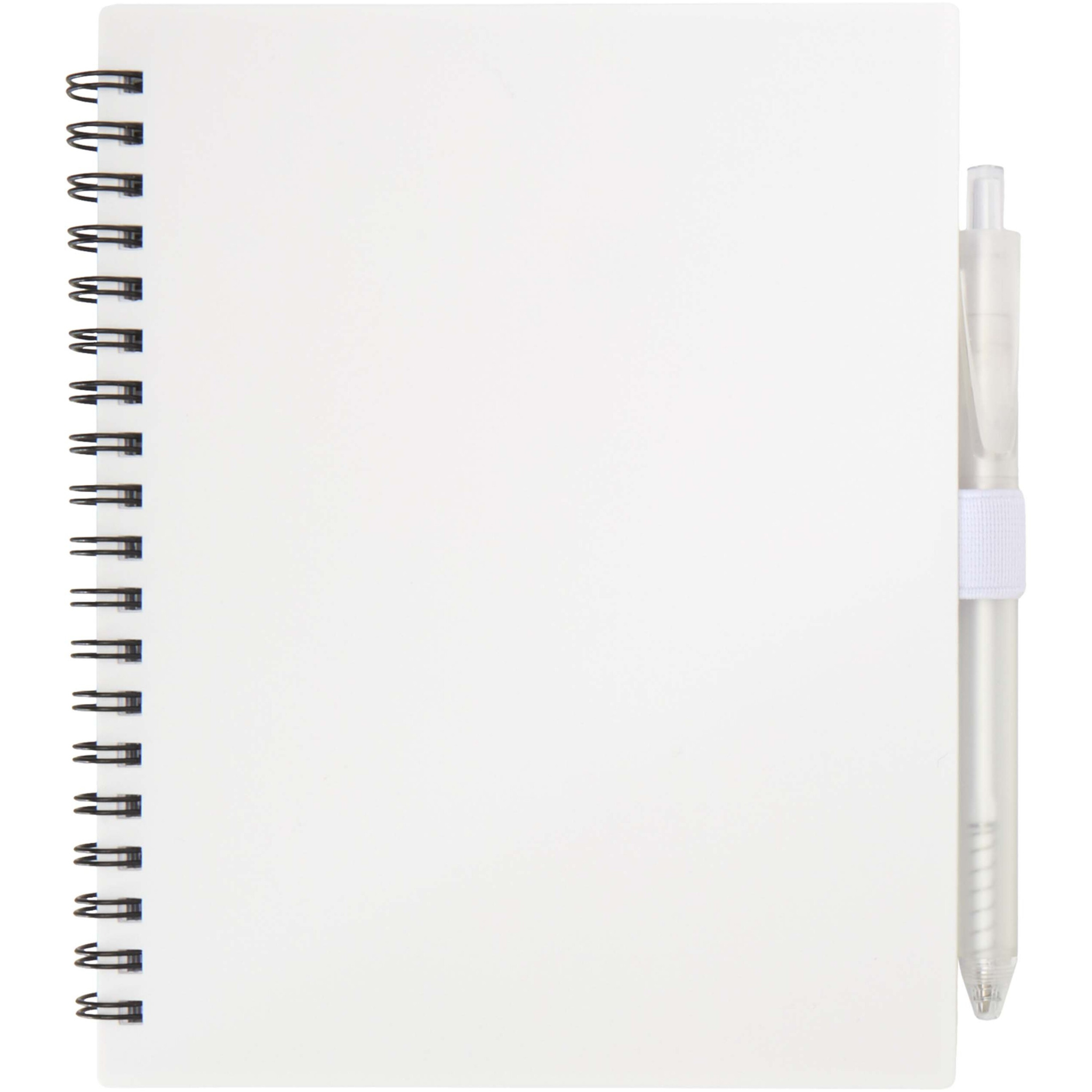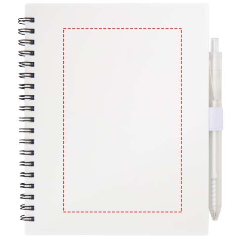 The Niove soft cover notebook is made of recycled plastic with 70 dotted sheets of 70 g/m² paper. The notebook has square corners and a pen loop. Notebook size: 140 x 178 mm. The ballpoint pen is also made of recycled plastic. Ink colour: Blue. Writing length: 1000 meters. Nib size: 1.0 mm.