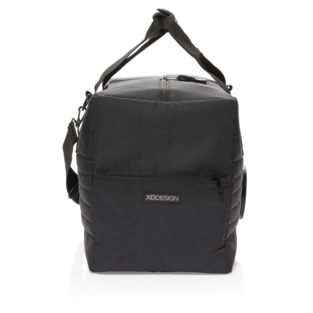 Large trendy cooler bag with removable waterproof IPX5 wireless speaker with colour changing LED. Simply twist to take out the speaker and place it on your desk. Up to 5 hours playtime. Fits up to 32 cans. Including shoulder strap. Registered design®